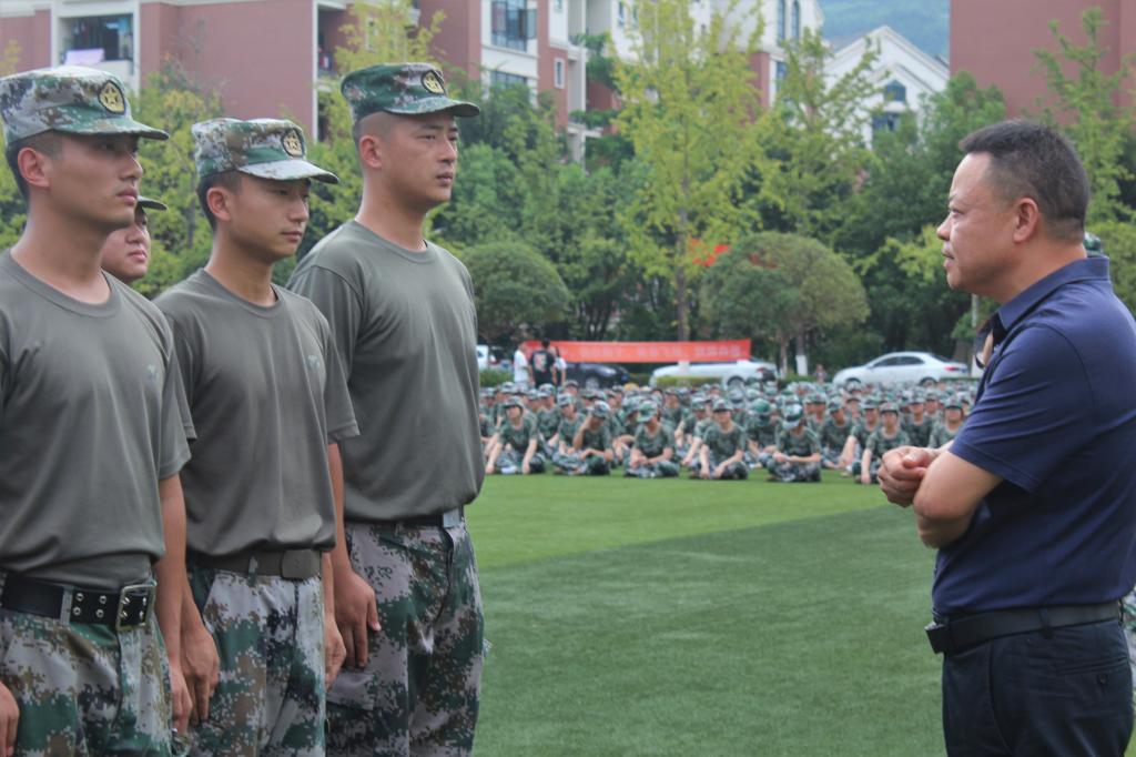 陈龙国副书记与刘敏参谋长会面后,对当前参训学员的训练情况进行检阅。陈副书记深入各个连队,了解学员们在训练中遇到的困难以及心态调整的情况,鼓励学员们要做到训练中不言弃,思想上不松懈。他指出,军训作为大学的入门必修课程,对增强学员们的团队意识、巩固国防知识有着极为重要的作用;通过这次军训,更能够培养学员们优良作风和积极向上的乐观精神,积极主动地挑起复兴中华民族的使命担当。俗话说:“流血流汗不流泪,掉皮掉肉不掉队”,学员们一定要学习“三不怕”精神,响应国家号召,力争成为新时代有志青年。