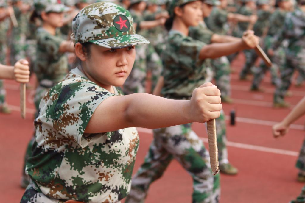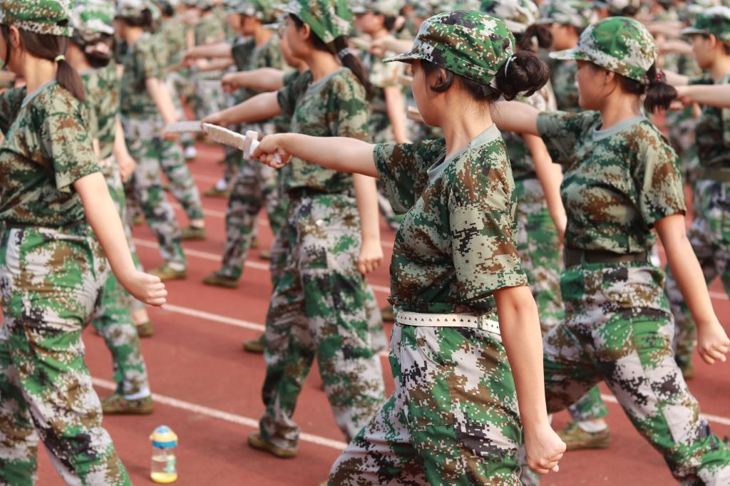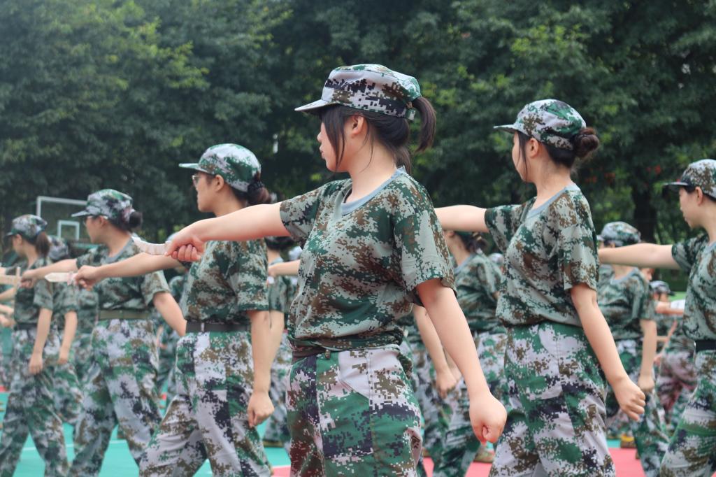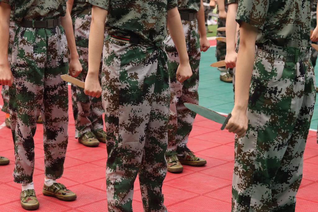 每每做完一个动作,一个“杀”字放声而出,燃出同学心中奋力火光,音浪久久回荡,难以平息。马步弓步跨步,亮刀挥刀收刀,刀起,是英勇;刀落,是坚定。匕首操,满足了每一位同学内心对军训酷帅模样的向往,酷雅英姿在场间齐齐飞扬。