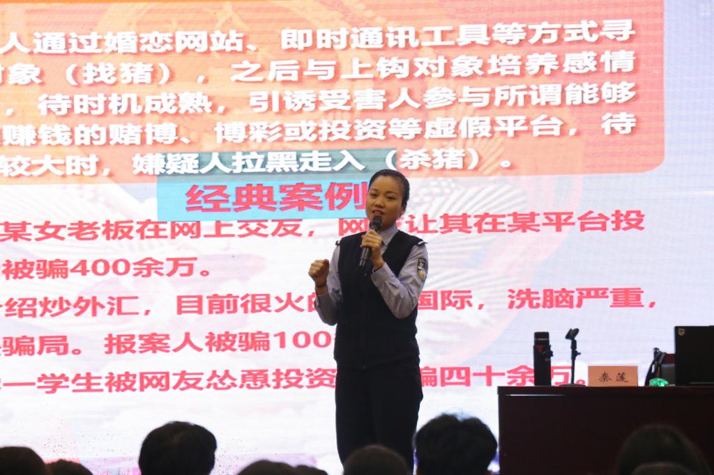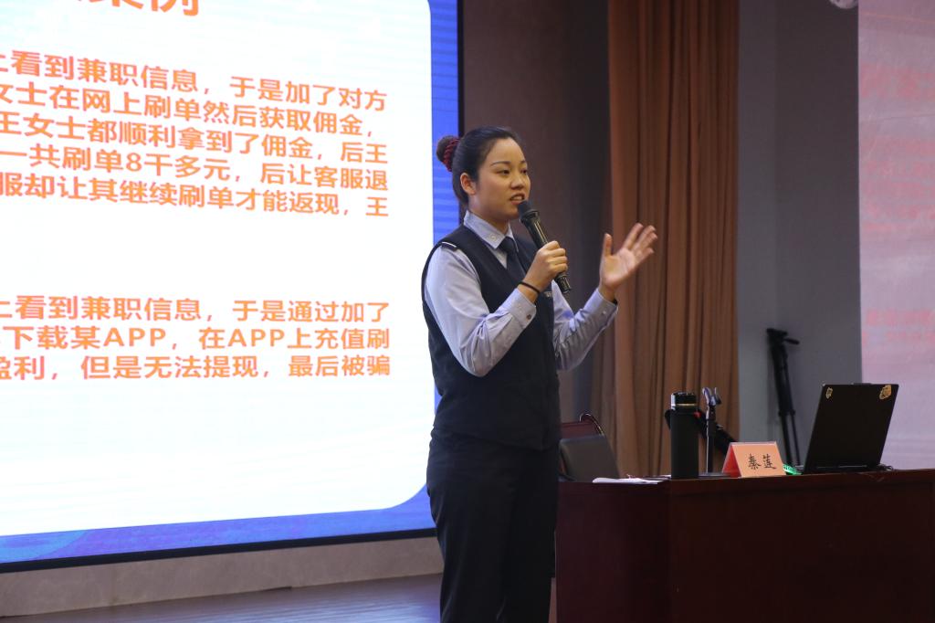 讲座开始,主讲人秦莲介绍了关于电信网络诈骗的定义,并对全市电信网络诈骗案件被害人的特征进行了分析,占比最高的年龄段为十九到三十岁,身处这个年龄段的重财师生们更应当提高自己的网络安全意识和技能。