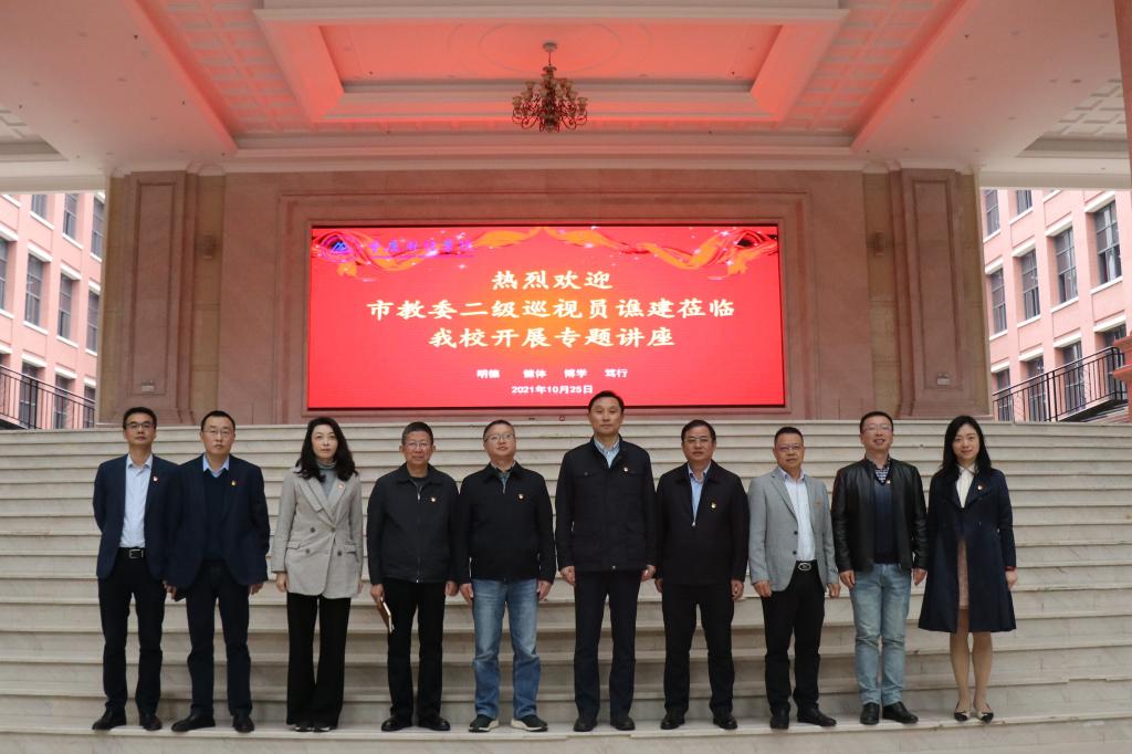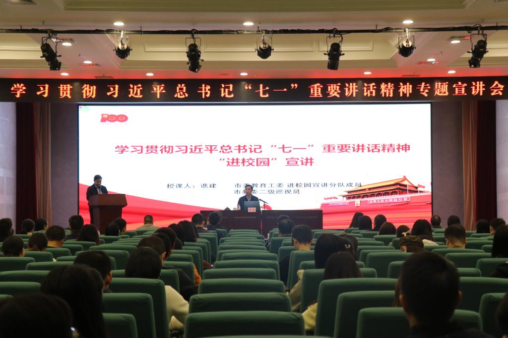 为认真学习贯彻习近平总书记“七一”重要讲话精神,持续深入推进党史学习教育。10月25日下午,我校学习贯彻习近平总书记“七一”重要讲话精神专题宣讲会在学术报告厅召开,由市教委二级巡视员谯建担任主讲。参加本次会议的有校领导、党委委员、纪委委员,中层干部、教师及学生党支部书记等。宣讲会由党委书记张毅主持。