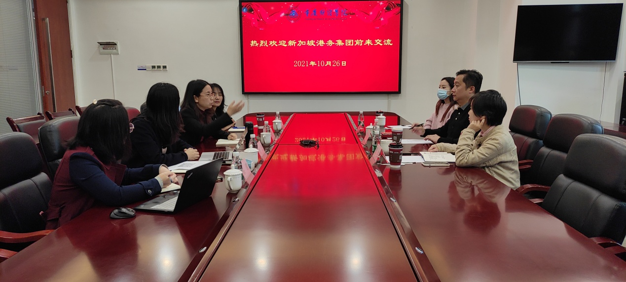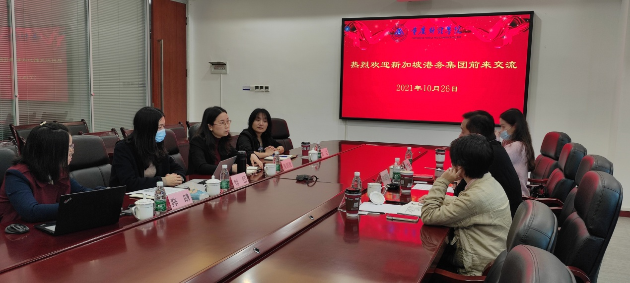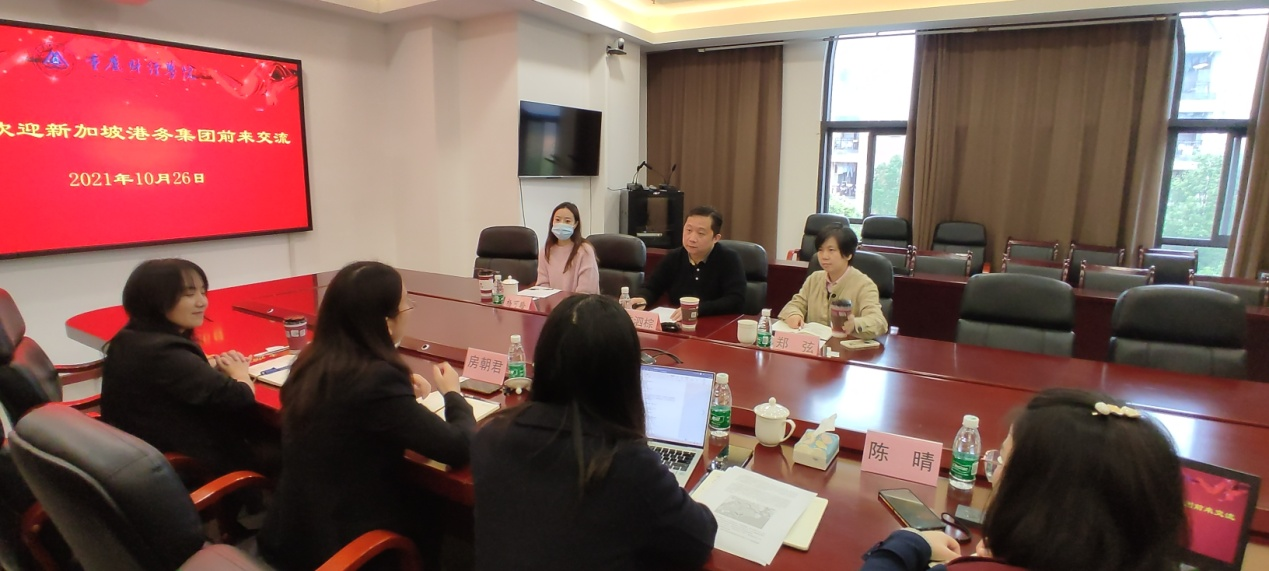2021年10月26日上午,新加坡港务集团中国区副总裁陈泗棕及重庆市中新示范项目管理局相关人员一行来我校考察交流,校长助理房朝君、教务处处长黄兰、物流工程学院院长刘岱接待了来访嘉宾。交流会在2303会议室举行,会议由物流工程学院院长刘岱主持。