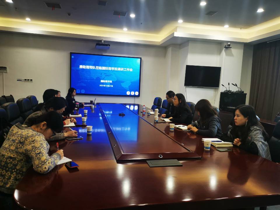 2021年10月27日下午15:00,校长助理房朝君、国际合作与交流处处长石转转、继续教育学院院长曾真、教务处副处长李军一行到国际商学院开展调研工作。国际商学院院长刘莉、国际商学院党总支副书记陈萍、大学英语课程组组长王梦莎、专职英语教师李雪、朱雪莲、丁孝岚等参加了会议。