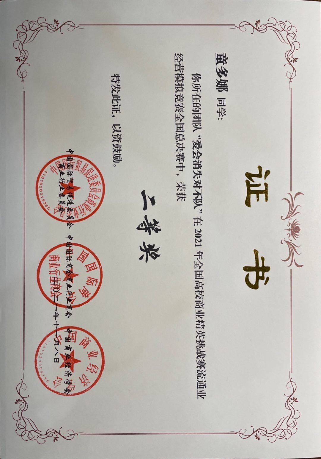 2021年10月28日,由教育部高等学校经济与贸易类专业教学指导委员会、中国国际商会商业行业商会和中国国际贸易促进委员会商业行业分会主办,深圳国泰安教育技术股份有限公司承办的2021年全国高校商业精英挑战赛“国泰安杯”流通业经营模拟竞赛大陆地区总决赛圆满落幕。由国际商学院教师李扬杰和卢芳冰指导的2支队伍喜获全国二等奖;胡欣指导的1支队伍喜获全国三等奖;3位指导老师获得“优秀教师指导奖”。