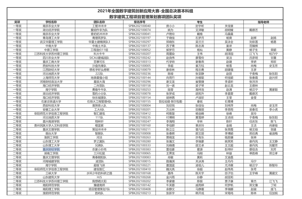我校公共管理学院工程管理教研室将该比赛与实践性教学环节有机融合,秉承“全员参与,重点培育”的原则,积极组织,认真谋划,最终经过三个多月的刻苦训练和细致的赛前指导,在刘芳、蔡佳含、柏芳燕和龙梅4位老师的指导和带领下,斩获全国总决赛二等奖1项,三等奖2项。