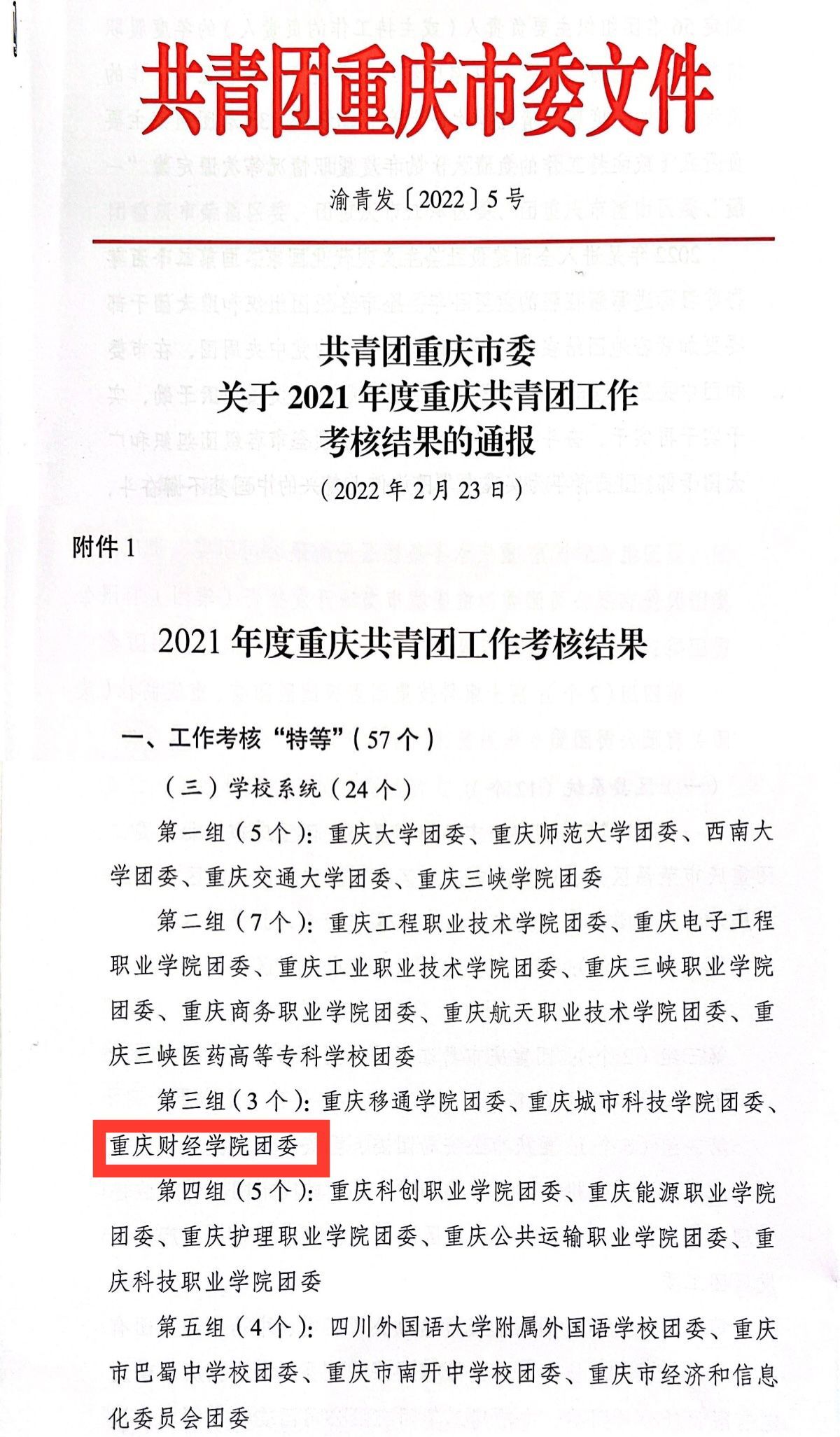 2月24日,共青团重庆市委五届七次全会召开,重庆共青团对重庆共青团对186个直属、重点联系团组织年度目标考核结果进行了通报,校团委在2021年度目标考核中荣获“特等”等次。
