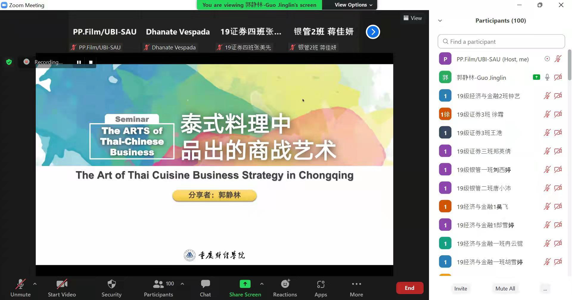 泰国东南亚大学王毅老师与我校郭静林老师担任主讲嘉宾,分别进行了网络授课交流。王毅老师认真讲解了泰国的历史、文化、教育以及泰中友好关系的渊源,并以自己在泰国的工作与生活经验入手,分析了泰国的投资环境以及中国企业在泰国的从商艺术及注意事项。郭静林老师从后疫情时代的商业变革、重庆的泰式料理商业格局、隐藏在吃喝中的商战艺术等方面,分析了泰式餐饮在重庆的起源与发展,并给创业初学者们提出了诚恳的建议。通过课程学习与案例分析,学生既了解中、泰两国的投资与贸易环境,又充分理解了产品细分、门店选址、价格差异、目标客户等商业战略。