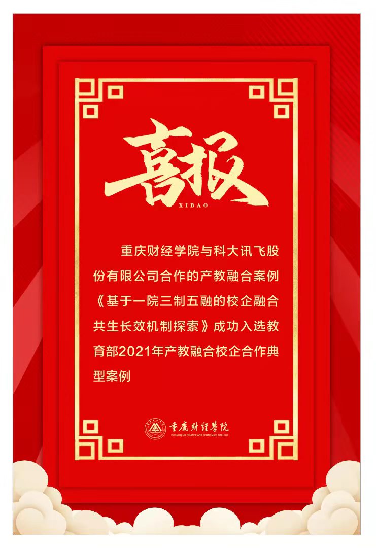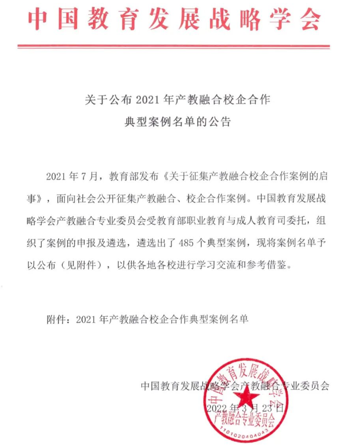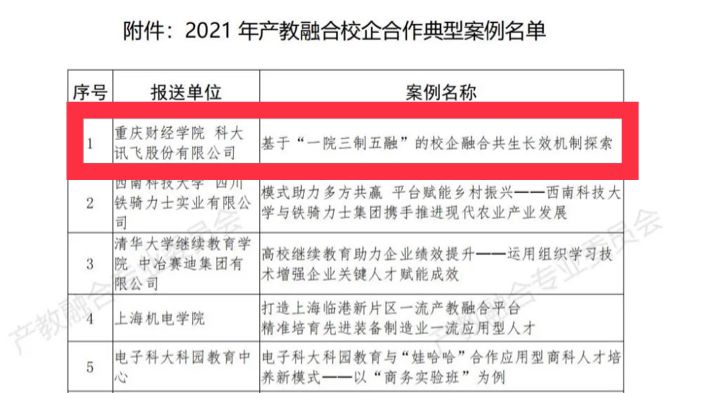 近日,中国教育发展战略学会产教融合专业委员会受教育部职业教育与成人教育司委托,发布了《关于公布2021年产教融合校企合作典型案例名单的公告》,由靠谱的电子游戏平台官网与科大讯飞股份有限公司共建的现代产业学院——讯飞人工智能学院组织申报、学校审核推荐的《基于“一院三制五融”的校企融合共生长效机制探索》作为典型案例成功入选,在485个案例中位列第1。