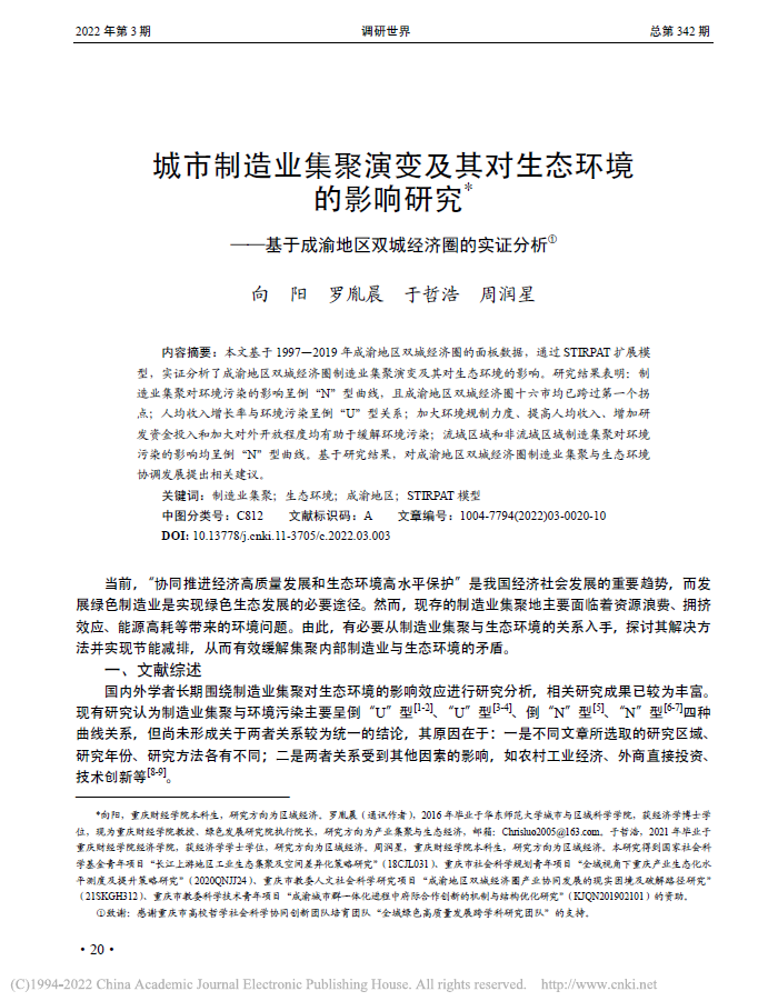 3月15日,我校经济学院2018级经济学1班本科生向阳同学在绿色发展研究院执行院长罗胤晨教授(通讯作者)的指导下,以第一作者身份撰写的学术论文《城市制造业集聚演变及其对生态环境的影响研究——基于成渝地区双城经济圈的实证分析》,正式公开发表于《调研世界》(CSSCI扩展版)2022年第3期。该文系我校本科生第一作者公开发表的首篇CSSCI级别期刊论文,实现了学校本科生C刊发表零的突破。