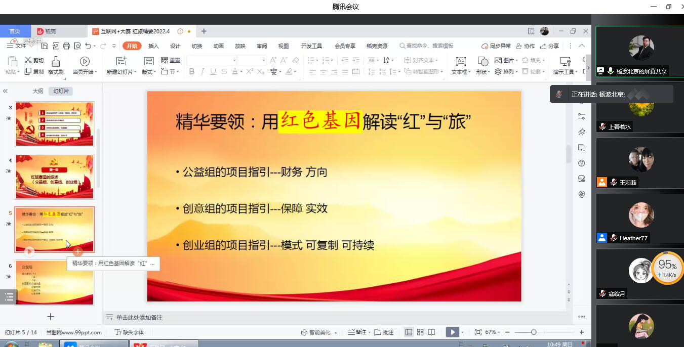 会上,杨波老师就第八届“互联网+”大赛赛事要求新变化、备赛工作模型及节奏、路演PPT要点及制作、答辩展示技巧、红色赛道备赛等五大方面进行了深入讲解。他提出,学校项目的遴选培育要明确学生的主导作用,从“三线”、“三层”、“七秘诀”给大家分享了大赛横纵向备赛精髓;也从路演PPT制作“三要点”、“三法则”,答辩“十要素”传授了高质量呈现项目创意、高水平表达项目观点的方法技巧;并从四个维度、六大关键点等细致讲解了红色赛道项目挖掘培养的重点渠道。最后在交流环节,参会老师踊跃发言提问,纷纷表示在此次指导会上获益匪浅、受益良多。杨波老师就参会老师提出的项目选题意义、项目服务模式、技术实现等各方面问题进行了耐心解答,为指导老师明确了项目优化、提升方向。