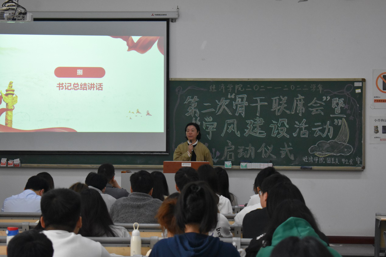 最后,经济学院党总支书记刘莉就经济学院具体的学风建设“一帮一”学习帮扶、寝室学风建设、科创学科竞赛、读书系列活动等进行了安排部署,并对全体学生骨干提出要求,要求每一位学生骨干成员在所在组织、班级都要发挥“火车头”的作用,引领创建优秀集体。