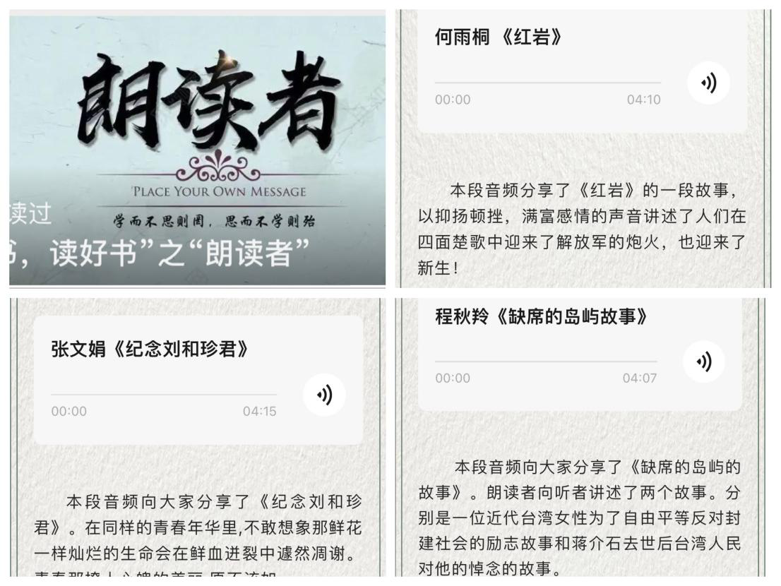 活动三-“朗读者”音频分享活动。让琅琅书声滋润书香校园,共建精神家园。本次活动共评出一等奖1个,二等奖2个,三等奖3个,优秀奖9个。一等奖音频里分享了《红岩》中革命者用自己坚强的意志,用牺牲和奉献的精神迎接胜利的炮火,成就后代们的美好生活。