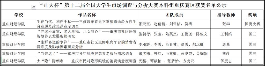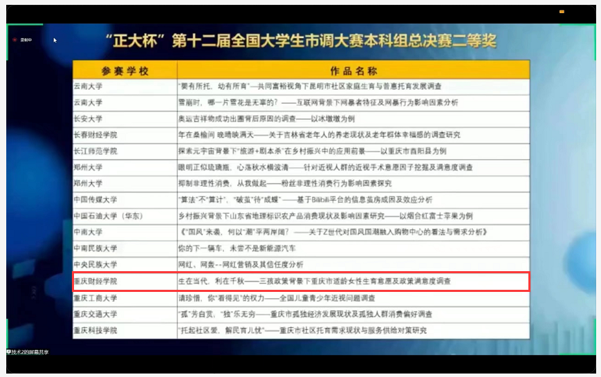 据悉,全国大学生市场调查与分析大赛自2010年启动以来,各省、自治区、直辖市累计有3700多校(次)、37万多人参赛。大赛已被纳入2014-2021年全国高校学科竞赛排行榜,是国内一流的全国性大赛,也是政府支持、企业认可、高校师生积极参与、两岸四地高度联动的统计学科实践教学平台。我校经济学院广泛宣传动员,组织342人参加理论知识网考(个人赛),38支队伍参加校赛(通过理论知识网考的个人才可参加校赛,3-5人一组),有15支队伍进入省赛。其中10支队伍获得省级奖项;经济学院的施朝行组、李邓辉组、张忱楠组和龚錾组,4个小组均获得国家三等奖;经济学院张天宝组的“生在当代,利在千秋——三孩政策背景下重庆市适龄女性生育意愿及政策满意度调查”进入国家总决赛并获得国家二等奖。