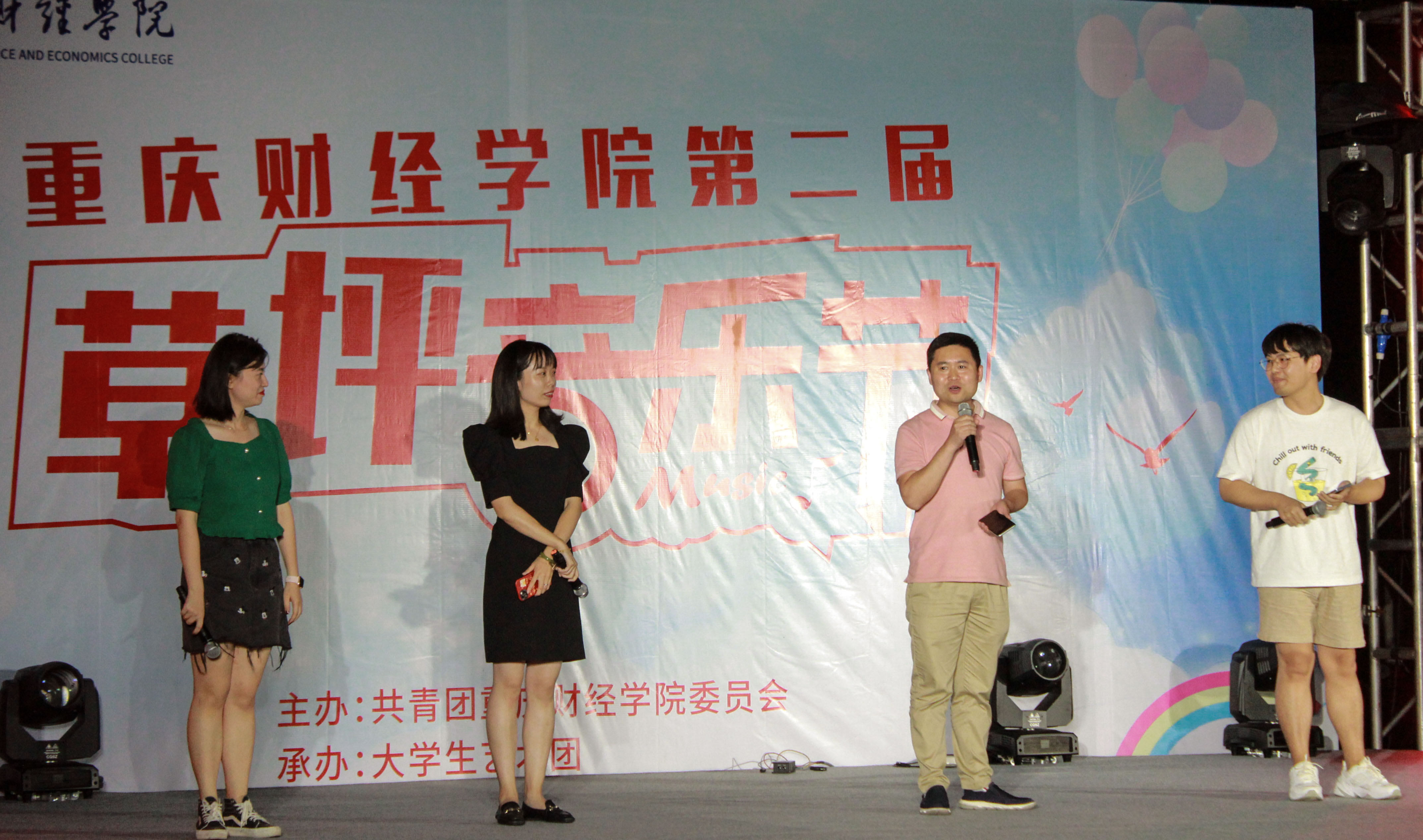 在同学们的欢呼声中,党群工作部部长李刚、团委书记夏文瑞,以及校团委刘艳娇、江蕊弘四位老师惊喜登台,并用《送别》《十年》《如果有来生》《安静》四首耳熟能详的歌曲为各位毕业生送上毕业祝福。随后,同学们带来的歌曲《一路向北》《我怀念的》乐音激昂,飞扬的鼓点流露出激励前行的铿锵力量;音乐会临近尾声,全体观众一齐唱响歌曲《这世界有那么多人》,闪光灯挥舞编织成一片璀璨星芒,活动圆满结束。