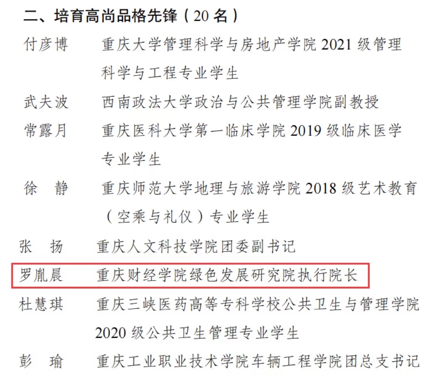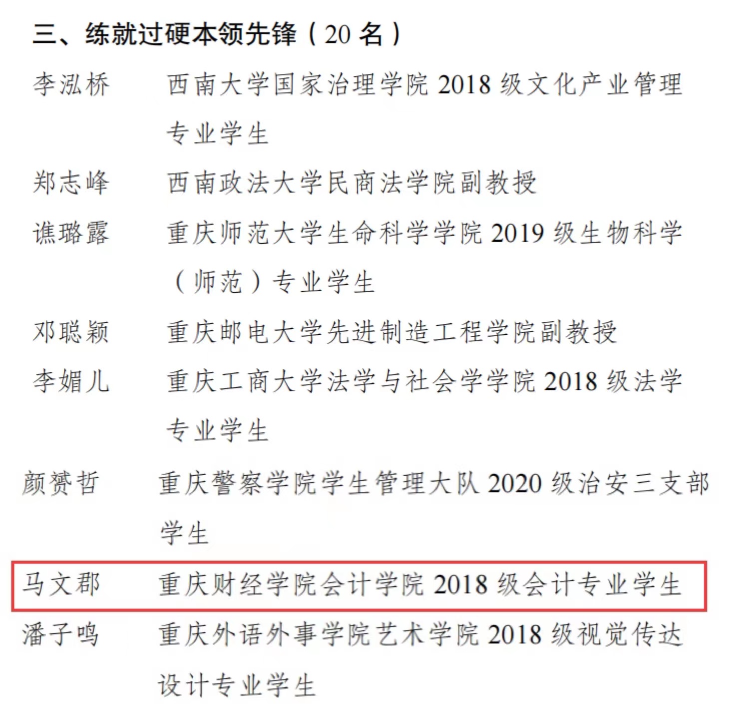 近日,2022年“双城青才校园先锋”典型选树活动评优结果在第41届川渝“校园之春”文化艺术体育活动闭幕式暨“双城青才校园先锋”颁奖礼上公布,我校会计学院黄翔、马文郡同学,物流工程学院刘婷婷同学和经济学院罗胤晨老师分别获评“坚定理想信念先锋”“练就过硬本领先锋”“矢志艰苦奋斗先锋”“培育高尚品格先锋”称号。