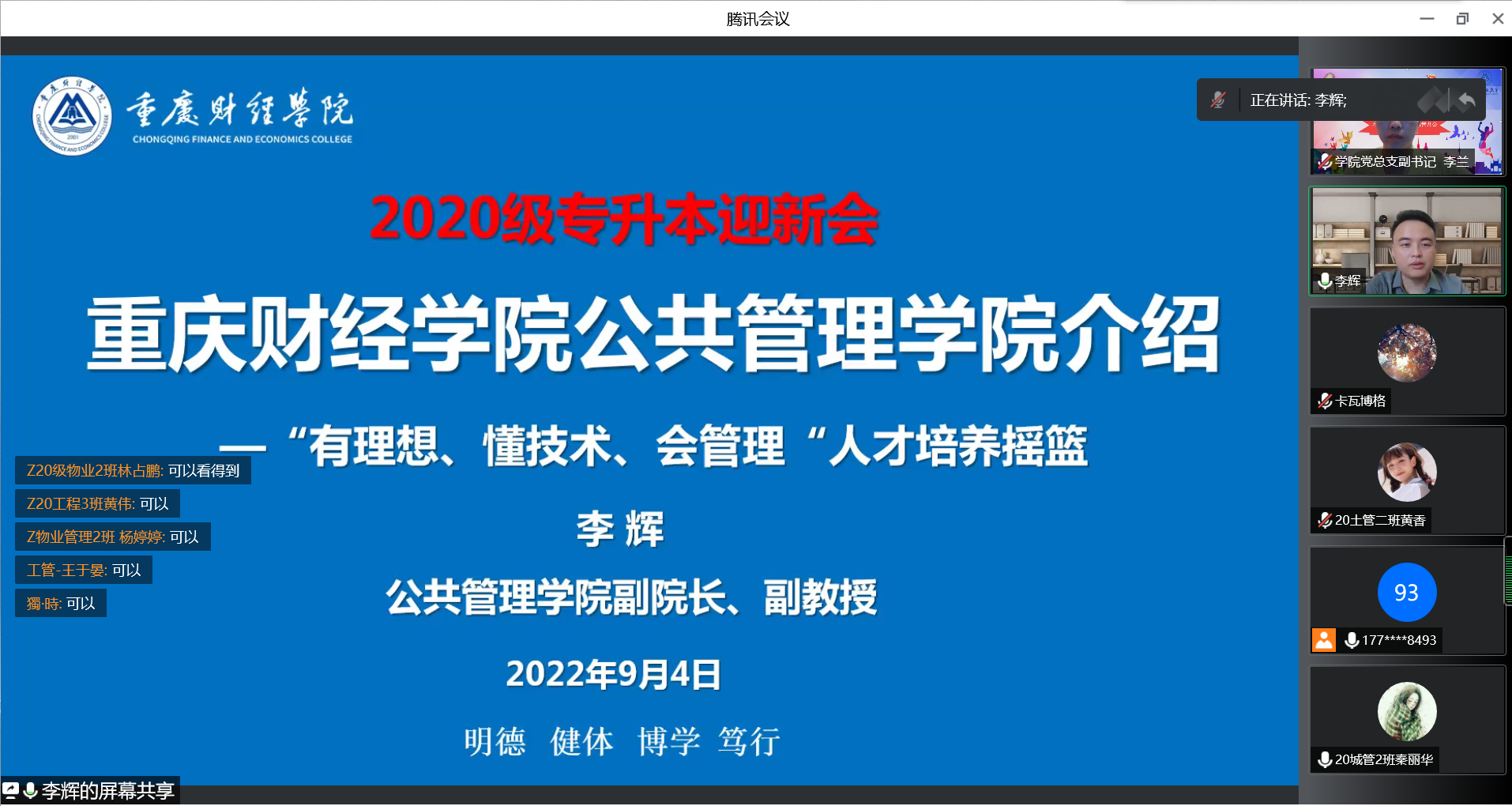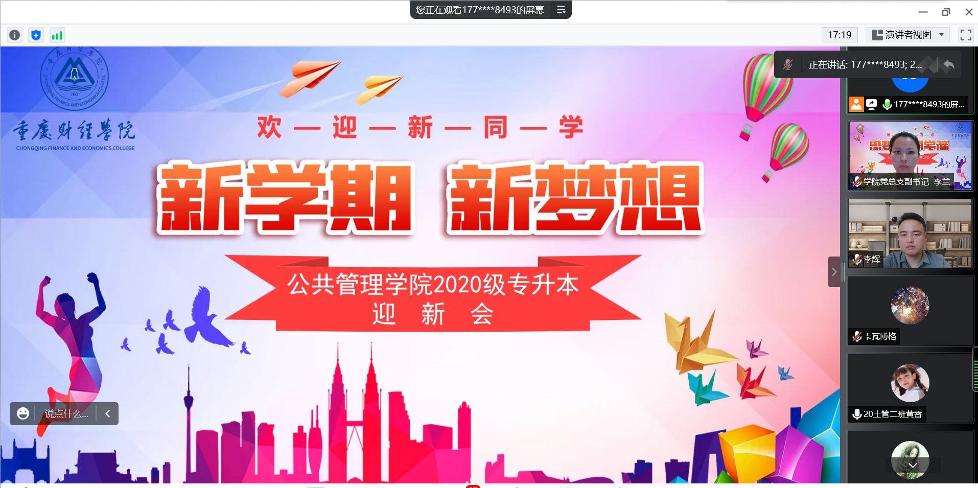 金秋九月,叠翠流金,新学期如约而至,隔离不隔爱,战“疫”有温情。为让2020级专升本新生更快适应大学生活、了解学校规章制度、明确未来前进方向,9月4日下午,我校公共管理学院举办了2020级专升本“新学期 新梦想——云端迎新会”,学院副院长李辉、党总支副书记李兰、新生辅导员及全体2020级专升本新生参加了此次迎新会。会议由余天霞老师主持。