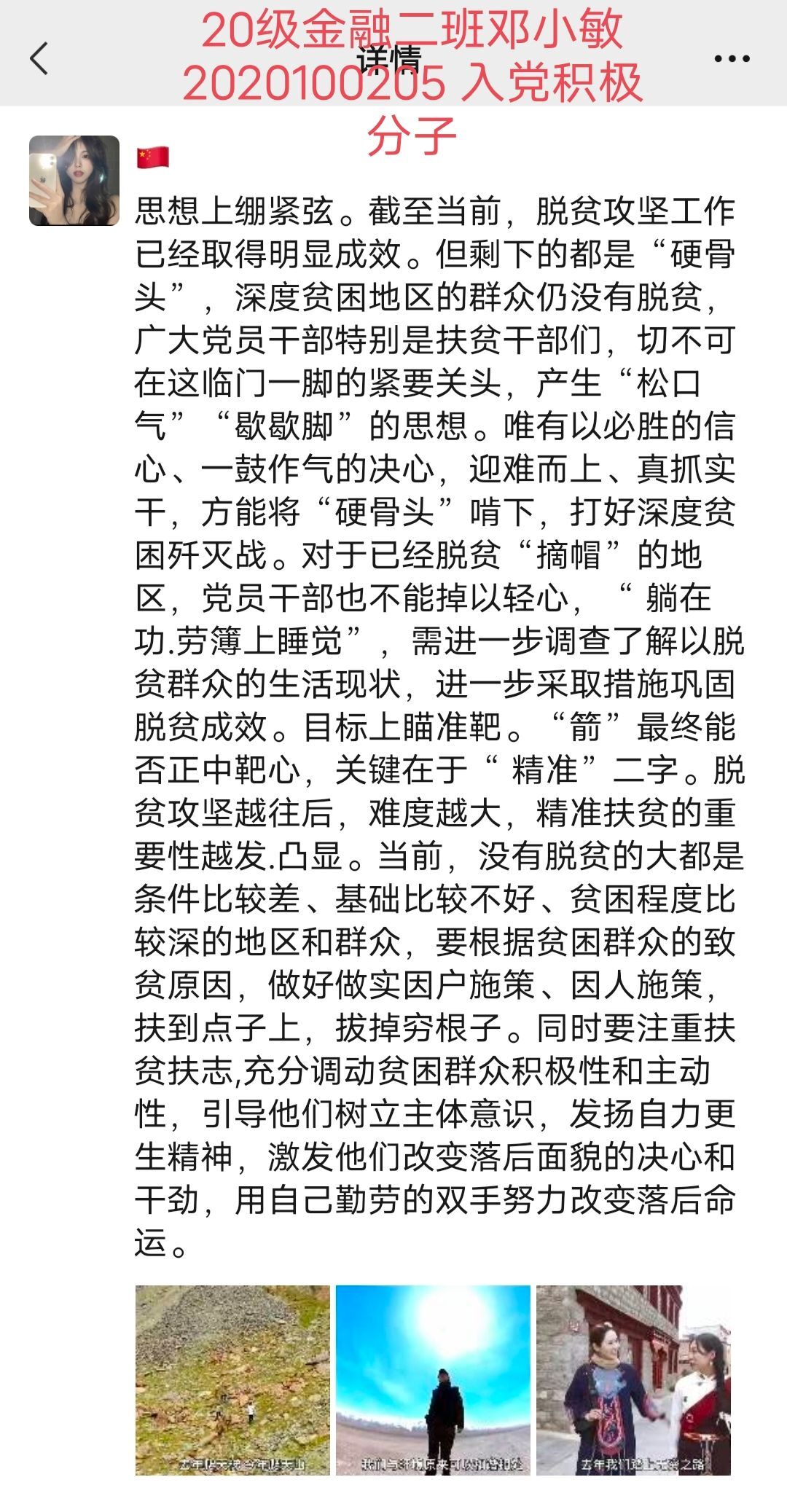 汲取脱贫之智,讲好中国故事。通过开展“汲取脱贫之智,讲好中国故事”党性教育活动,让学生党员和入党积极分子们跟随着《无穷之路》的主持人穿越崇山峻岭、戈壁沙漠,了解了一个个鲜活的人物与饱含真情的故事,感受着这片土地因为扶贫政策所产生的翻天覆地的变化,体会到国家“精准扶贫,科学扶贫”政策的真正内涵。参与本次活动的学生党员、入党积极分子共190名,共收集微信朋友圈感想截图358份。