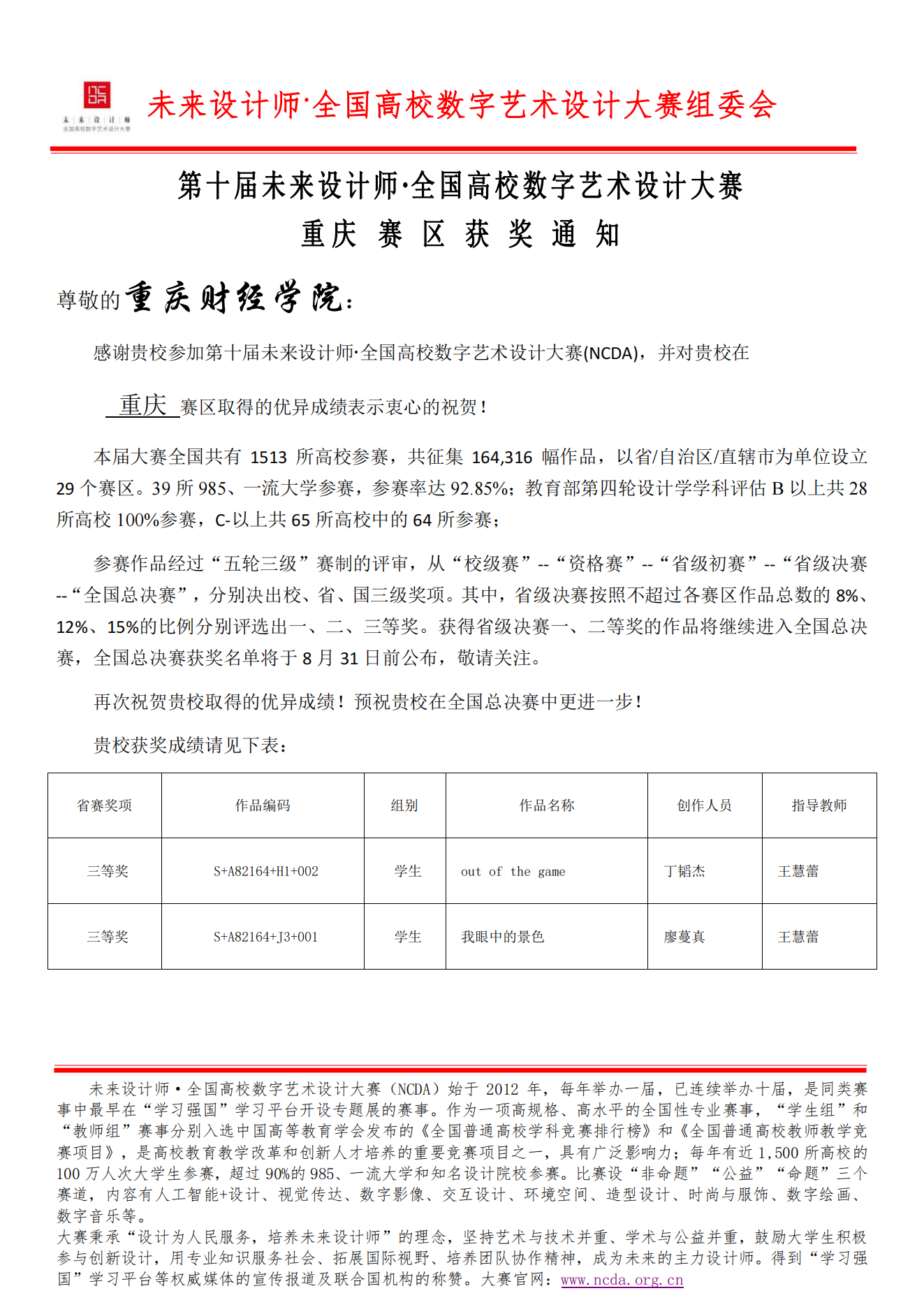 近日,第十届未来设计师·全国高校数字艺术设计大赛(NCDA)重庆赛区获奖名单正式公布,我校新媒体艺术学院数字媒体艺术专业两名大一学生分别数字绘画、数字摄影设计类别中获得三等奖的荣誉数字媒体艺术专业于2021年首届招生,此次为我校首次参赛,并取得该项赛事获奖零的突破。
