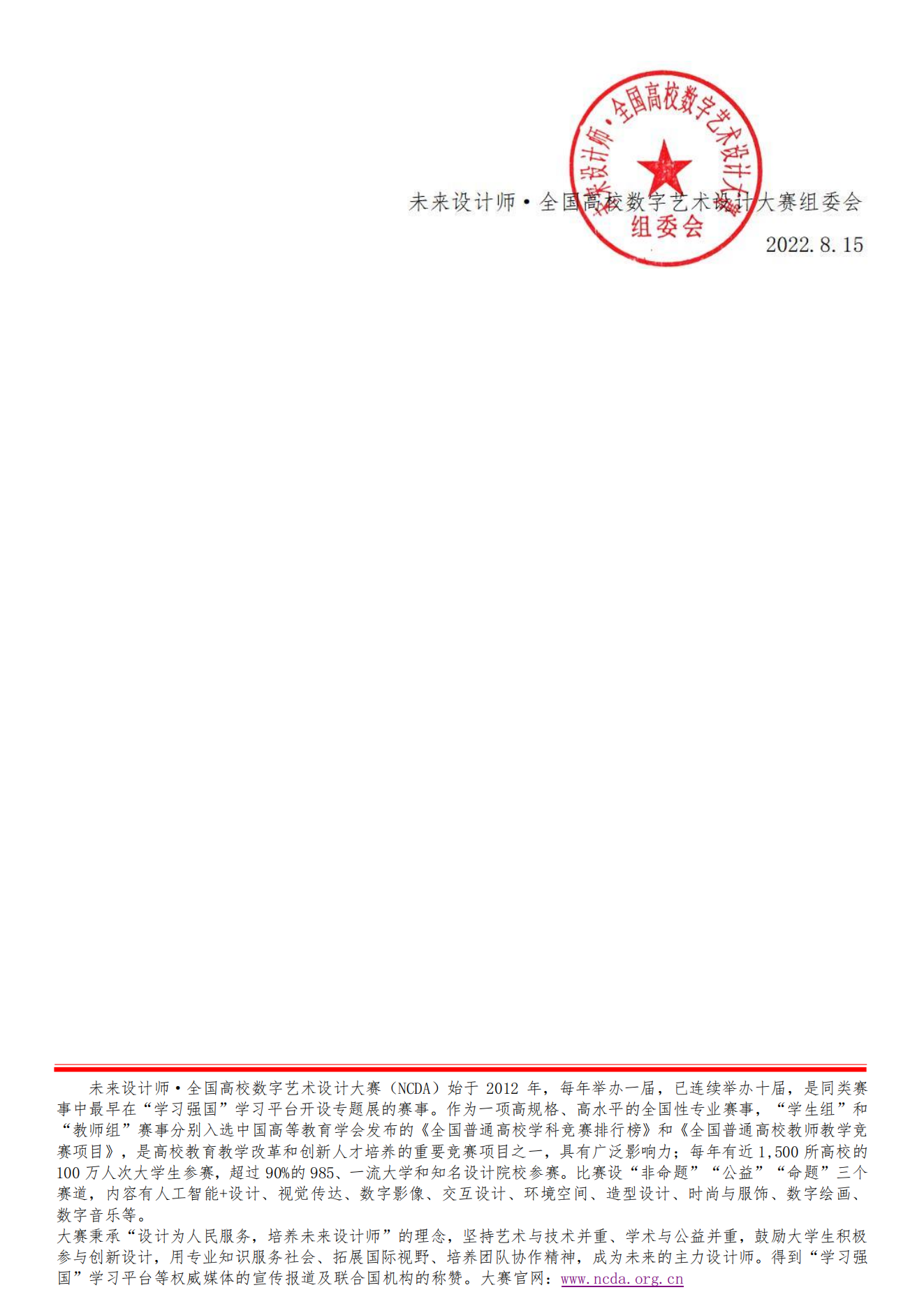 全国高校数字艺术设计大赛(未来设计师NCDA大赛)是教育部中国高等教育学会发布的《全国普通高校学科竞赛排行榜》内竞赛项目,是高校教育教学改革和创新人才培养的重要竞赛项目之一,为大学生参与设计创新活动的重要平台。大赛秉承“设计为人民服务,培养未来设计师”理念,坚持艺术与技术并重、学术与公益并重,引导大学生将专业知识服务于社会,提升大学生设计创新与实践能力,拓展国际视野及团队协作精神,成为未来的主力设计师。得到“学习强国”学习平台、中国教育报等权威媒体的宣传报道及联合国机构的称赞。