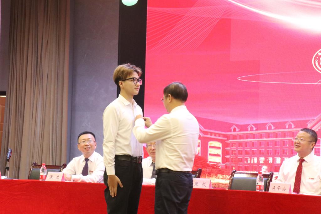 一举千金校徽赋予重财使命。庄严的线上线下共同奏唱中华人民共和国国歌仪式后,党委书记张毅为新生代表佩戴校徽,将重财“明德、健体、博学、笃行”的校训精神寄予全体新同学们,期以承载重财人的使命和荣光开启美好的大学时光。