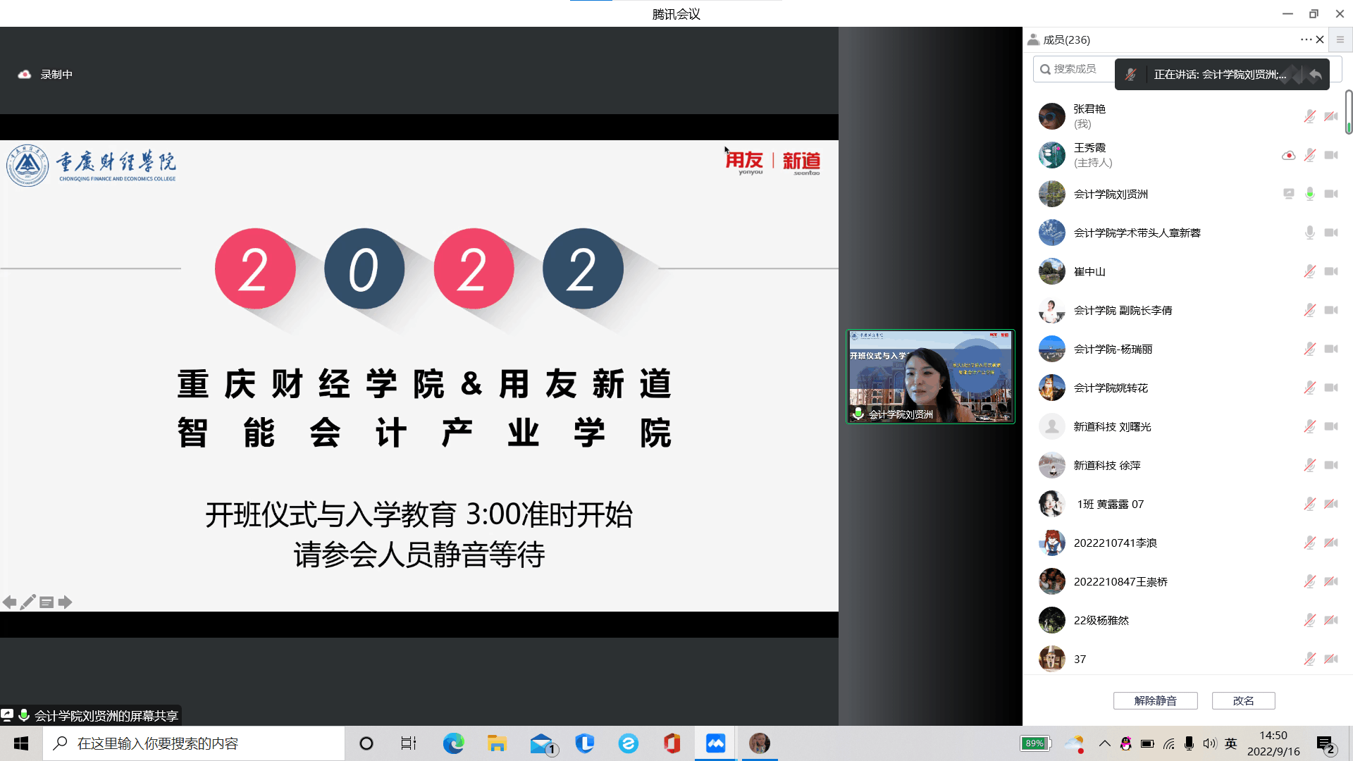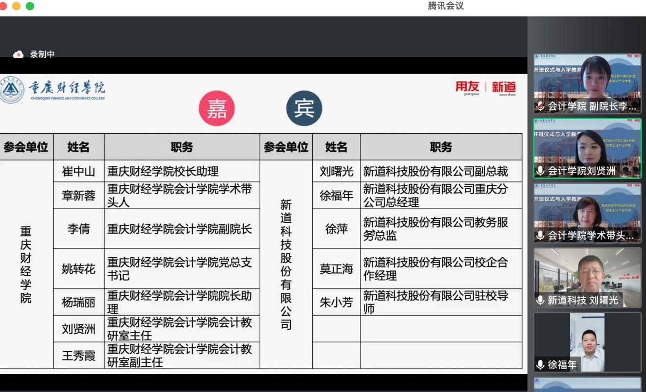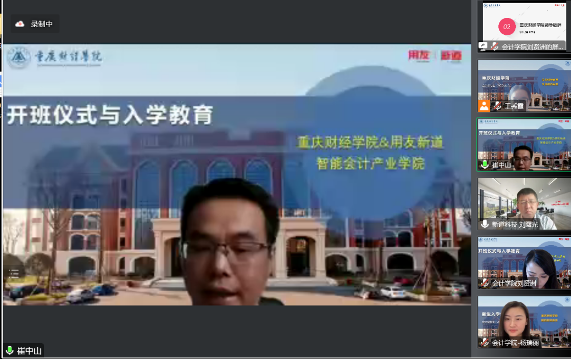 为推进校企合作,培养高质量会计人才,促进会计学院2022级新生对智能会计的了解,使新生进一步明确未来四年的发展目标,2022年9月16日下午,靠谱的电子游戏官网会计学院于线上举行了智能会计产业学院开班仪式与专业入学教育。参加本次会议的嘉宾有:靠谱的电子游戏官网校长助理崔中山、会计学院学科带头人章新蓉、会计学院副院长李倩、会计学院党总支书记姚转花、会计学院院长助理杨瑞丽、会计学教研室主任刘贤洲、会计学教研室副主任王秀霞,新道科技股份有限公司副总裁刘曙光、重庆分公司总经理徐福年、教务服务总监徐萍、校企合作经理莫正海、驻校导师朱小芳。会计学教研室主任刘贤洲老师主持了本次会议。