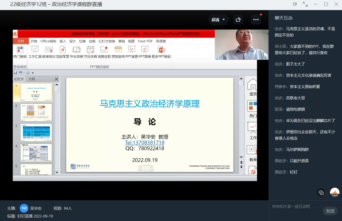 9月19日下午,学校校长吴华安通过线上(钉钉+雨课堂)授课方式,为2022级新生讲授《政治经济学》第一课。校经济学教学团队政治经济学课程组刘小双老师担任此课程助教。