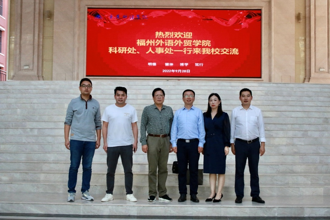 9月28日,福州外语外贸学院科研处、人事处一行来我校交流科研与人才工作,并举行座谈会。福州外语外贸学院科研处处长吴钦缘、人事处处长钟杭州、科研处副处长黄丽华,我校组织人事部部长谢付杰、公共管理学院副院长李辉参加会议,校长助理张立教授主持会议。