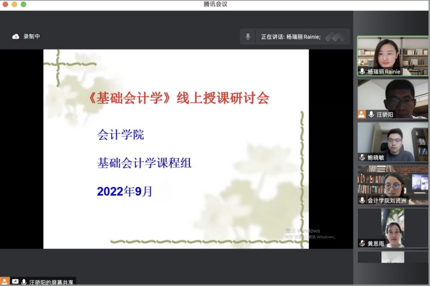 课后-开展课程组线上教学研讨会。课程组汪骄阳老师分享了线上授课的经验。然后,各位老师讨论了网络教学中出现的问题,对各种突发状况给出了应急预案。最后,课程组还就本学期基础会计学实验教学改革、基础会计学考核方式改革等问题进行了讨论。会上还对基础会计学课程的教学计划、大纲、教案进行了修订。