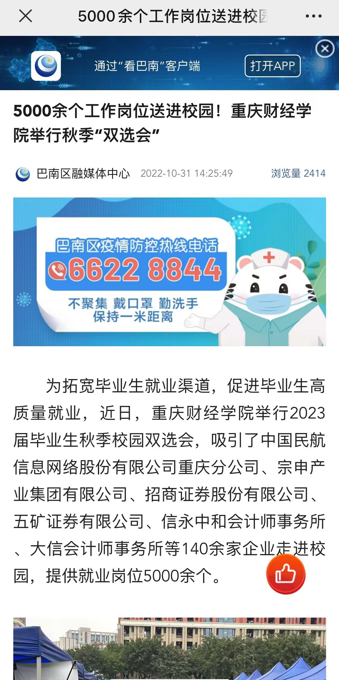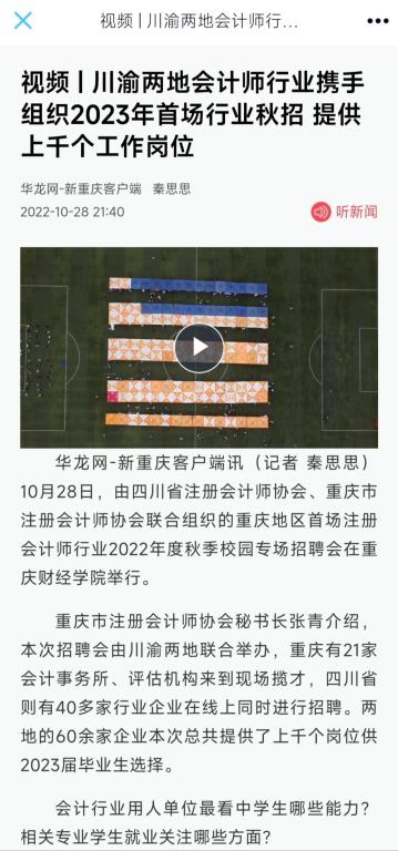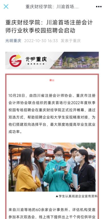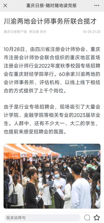 为推进我校2023届毕业生就业工作,构建企业与我校毕业生交流平台,10月28日上午,我校2023届毕业生双选会活动在运动场举行。此次活动以“靠谱的电子游戏平台官网2023届毕业生秋季校园双选会”和“川渝两地注册会计师行业协会2022年度秋季校园招聘会”的“1+1”双主题形式开展,受到了光明重庆、巴南区融媒体中心、华龙网和重庆日报在内的多家媒体平台报道,反响良好,关注度高。 1.光明重庆《靠谱的电子游戏平台官网:川渝首场注册会计师行业秋季校园招聘会启动》 https://mp.weixin.qq.com/s/dKxQJx_GkZua95Di11pJvA 内容摘要:“作为应用型大学,产教融合至关重要。”靠谱的电子游戏平台官网党委副书记房朝君介绍,近年来,靠谱的电子游戏平台官网强力实施产教融合提质工程,通过与产业学院合作办学、人才定制班培养、校企合作等多种模式不断促进产教融合高质量发展,把企业需求前置到教学程序中,全面深化校企合作,不断拓展学生就业新空间,真真正正将产业需求跟教学供给进行深度融合。下一步,学校将持续开展小型招聘会、专场招聘会等就业指导服务,与社会各界共同推动学校就业工作再上新台阶。 2.重庆日报《川渝两地会计师事务所联合揽才》 https://wap.cqrb.cn/detail?id=1298399&classId=558 内容摘要:靠谱的电子游戏平台官网财富管理学院党总支书记兼院长贺高祥介绍,注册会计师行业专场招聘会是当天靠谱的电子游戏平台官网“1+1”双主题双选会之一,学校这天还同时举行2023届秋季校园双选会。注册会计师行业2022年度秋季校园专场招聘会上,重庆有21家会计师事务所、评估机构来到现场揽才,四川省则有40多家行业企业在线上同时进行招聘。 3.华龙网《视频| 川渝两地会计师行业携手组织2023年首场行业秋招 提供上千个工作岗位》 https://h5.cqliving.com/info/detail/97621338.html?cid=97621338&f=20&sp=source_share&cqxhlwdc=3f 内容摘要:近年来,靠谱的电子游戏平台官网探索出校企共建现代产业学院的合作办学新机制。通过把人才培养前置,与产业需求全方位融合。截至目前,学校已分别与科大讯飞股份有限公司共建讯飞人工智能学院,与中软国际教育科技集团共建中软国际大数据现代产业学院,与重庆誉存大数据科技有限公司共建中新金融科技现代产业学院、与中新互联互通(重庆)物流发展有限公司共建中新国际贸易与供应链产业学院,与新道科技股份有限公司共建用友新道智能会计产业学院。 4.巴南区融媒体中心《5000余个工作岗位送进校园!靠谱的电子游戏平台官网举行秋季“双选会”》 https://share.cqliving.com/news-detail-pages/?t=20221103&f=20#/graphic/graphic-page?appId=34&cid=97635457&sp=source_share 内容摘要:靠谱的电子游戏平台官网相关负责人表示,此次双选会是为深入贯彻落实国家“稳就业、保就业”的政策要求,促进毕业生更充分、更高质量就业。
