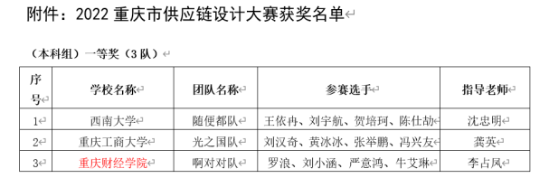 近日,2022·重庆市大学生供应链设计大赛圆满落幕。经过激烈的角逐,我校物流工程学院选送的“啊对对队”喜获大赛一等奖,“春日部防卫队”喜获大赛三等奖。