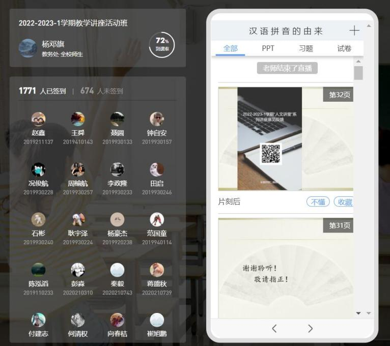 本周由教务处组织,学生工作部协同,邀请马克思主义学院杨邓旗老师、经济学院潘曦老师和金融学院郭静林老老师分别开展《汉语拼音的由来》、《合作的进化》和《你有想过你的未来吗?——如何走好后疫情时代的大学生就业创业之路》三次人文讲座,全程通过雨课堂进行直播,共吸引了4100余名学生参加,共收到1428条交流信息反馈,有效信息763条,一定程度上调节疫情防控期间同学们的课余生活,营造积极向上的校园学习氛围。