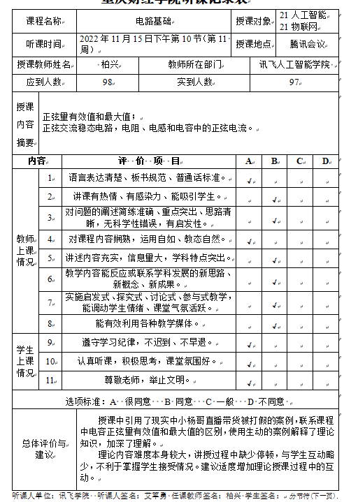 学校封控期间,校院两级督导进行听课共76人次。各二级学院院长、助理进入课堂听课查课190次。各学院均建立以院长为组长的学院教学质量监控小组,财富管理学院建立“各教研室线上教学信息”日报制,金融学院成立了线上教学领导组、教学运行保障组、教学质量督导组、教学信息反馈组、教辅工作组五个工作小组。讯飞人工智能学院、公管管理学院、国际商学院进行课堂随机查课并做了详细的听课记录,建立线上教学效果的多维度、多主体、多视角的效果评估体系。