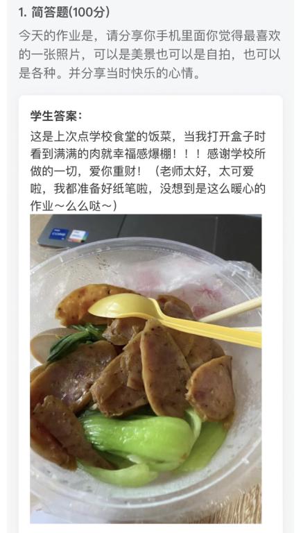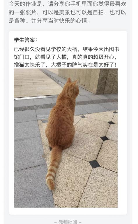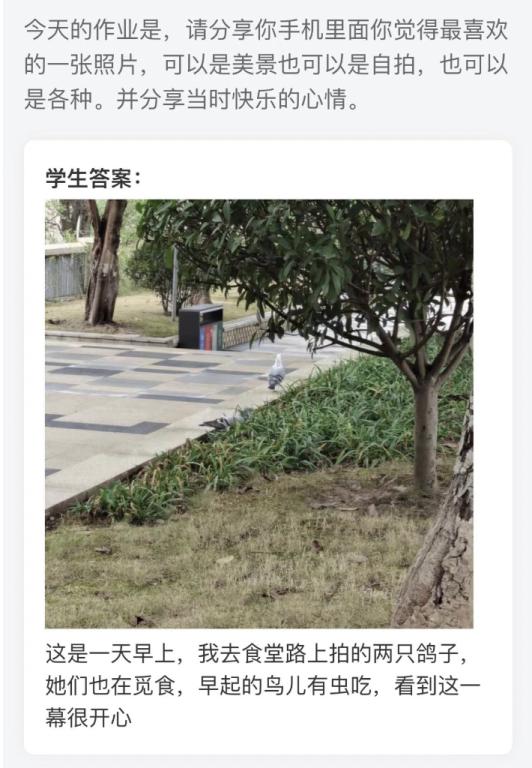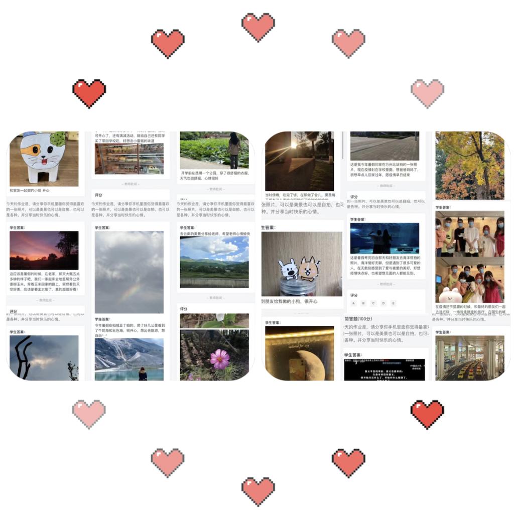 “教者有心,学者得益”。自11月初开展线上教学以来,教师如何优化学生作业设计,如何及时批改和评价反馈学生的作业显得尤为重要。我校某教师为了关心学生的身心健康有效舒缓学生疫情在校期间的不良情绪在完成了本周的教学任务后特意给学生布置了一道温暖的”云端作业”作业题目是请分享你手机里面你觉得最喜欢的一张照片可以是美景也可以是自拍也可以是其他并分享当时快乐的心情随后学生们纷纷上传了自己心中最喜欢的一张照片并纷纷讲述了照片背后的美好故事