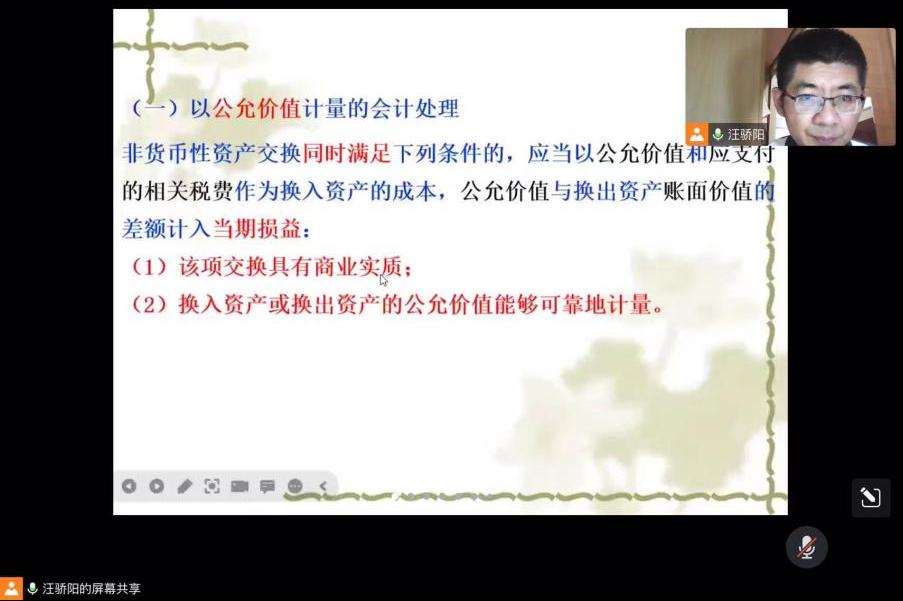 他积极投身于学校的疫情防控志愿者行列担任起核酸扫码员的工作还肩负着线上教学的任务脱下防护服,戴上耳麦,走进课堂。作为高级财务会计学课程组的一员,他运用雨课堂+腾讯会议共享屏幕、语音直播等方式,讲解难点、强调重点;在课下利用超星学习通辅导学生,进行“作业、习题+测试+讨论+答疑”,按照教学计划有序组织教学。同时汪骄阳老师还注重价值引领,更强调“敬畏生命”和“认真负责”的工作学习态度,将安全意识与专业知识入脑入心。他说“病毒无情人有情,我们作为一名教师就是学生的一道光!