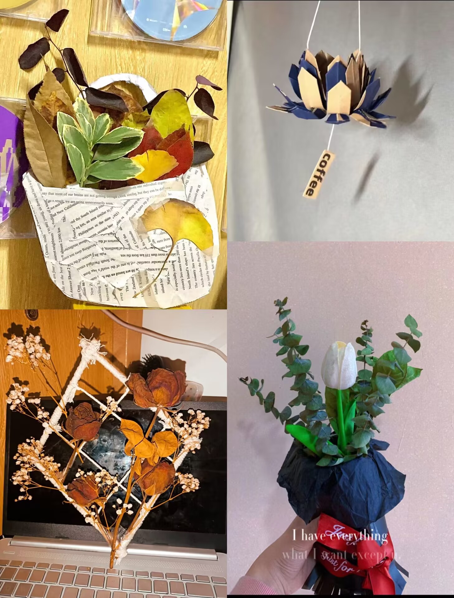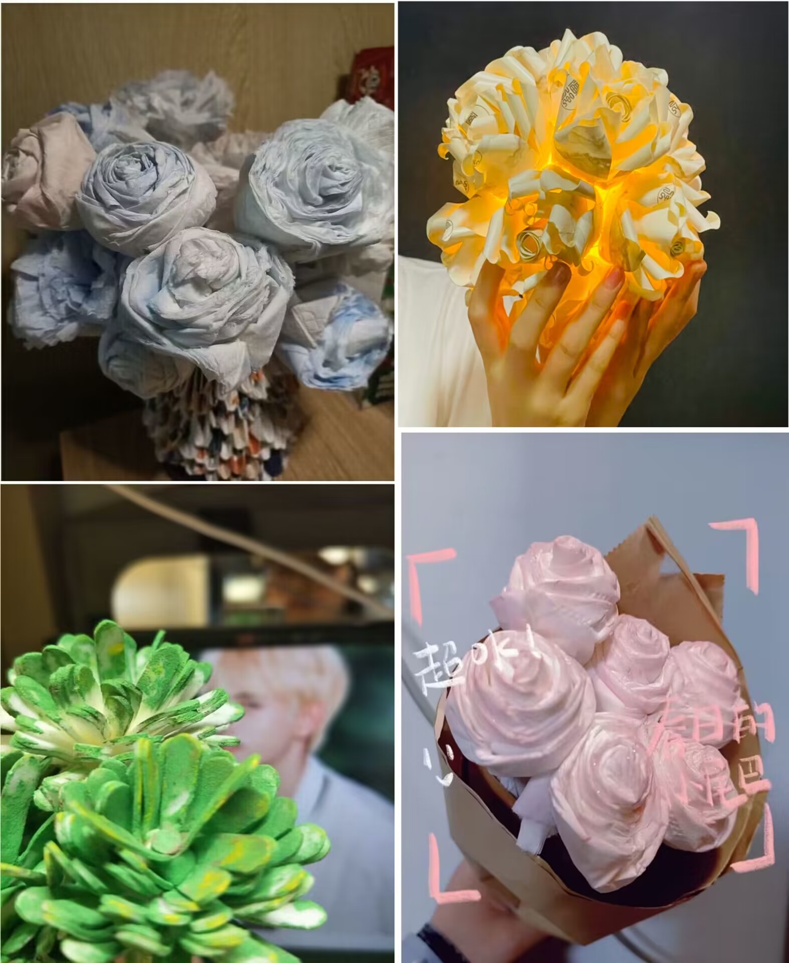 花店不开了,花也可以继续开,心怀浪漫,寒冬也可以变成春暖花开。平日里废弃的草稿纸或者口罩也可以变得可爱,用这些物品制成的鲜花永不会凋零,从此冬日暖阳下又多了一分温暖。