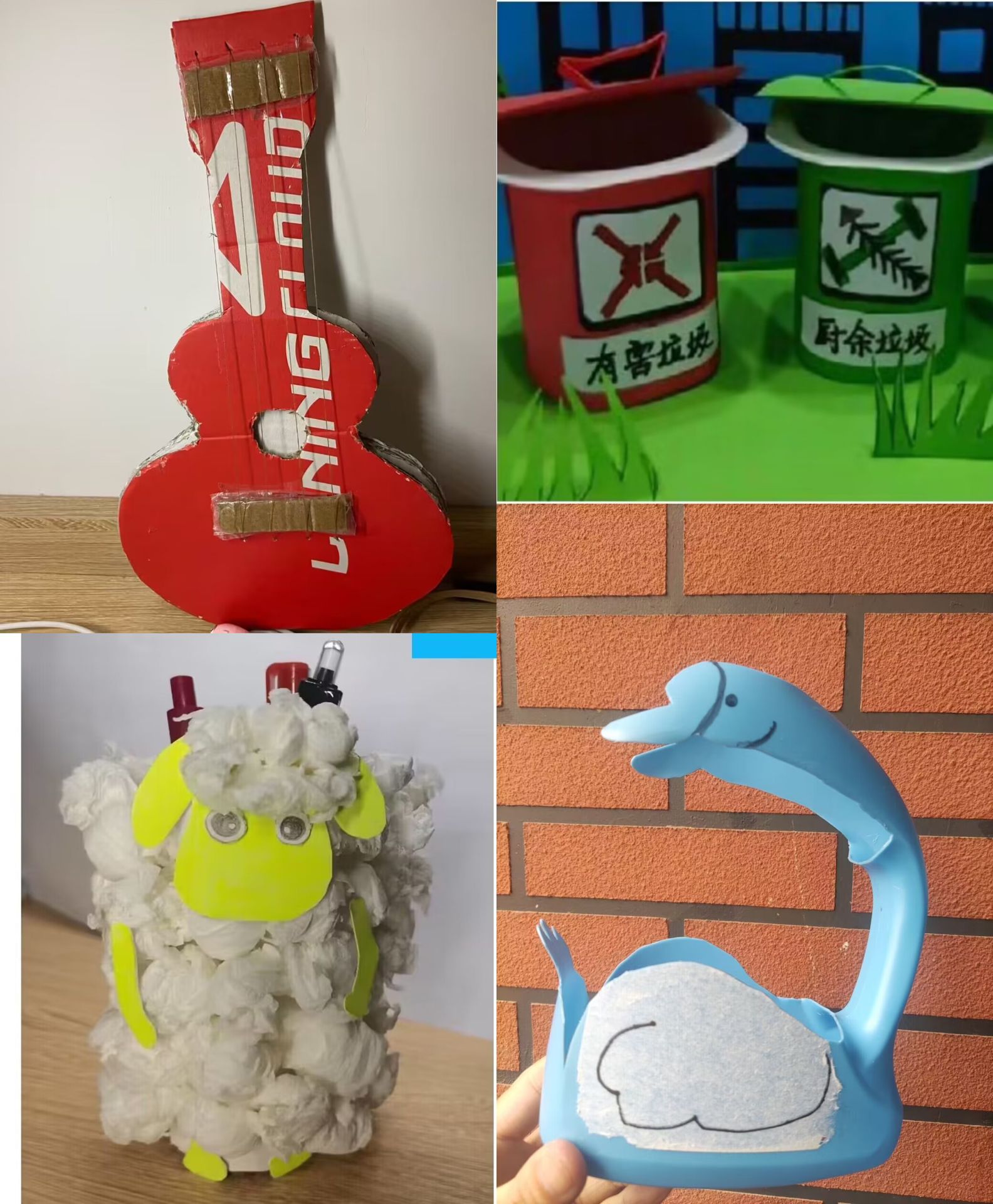 收生活里的零星,纳日常中的琐碎。用废旧纸箱和塑料瓶改造的“吉他”、收纳盒等物品,不仅节约了宿舍杂物的堆放空间,还增添了生活幸福感,让空荡的宿舍变得更加具有烟火气息。