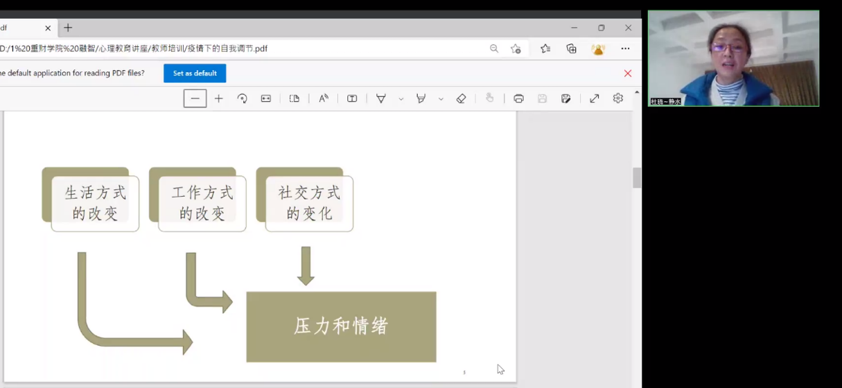 为进一步缓解疫情防控期间教职工的心理压力,减轻心理负担,确保广大教职工疫情期间的身心健康稳定,教师发展中心于11月29日晚组织开展“疫情下的自我调节”讲座。本次讲座以腾讯会议的形式进行,国际商学院杜晓晴教授担任主讲嘉宾,全校50余名教职工参加了此次讲座。
