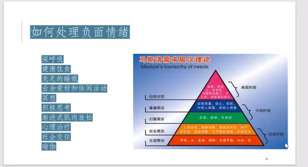 其次谈到如何处理负面情绪的方案,以及建立安全感和归属感的重要性。再从积极心理学的角度,鼓励大家从积极的情绪、参与、关系、意义、成就五个幸福要素去生活,用积极的心态面对生活中的挑战。
