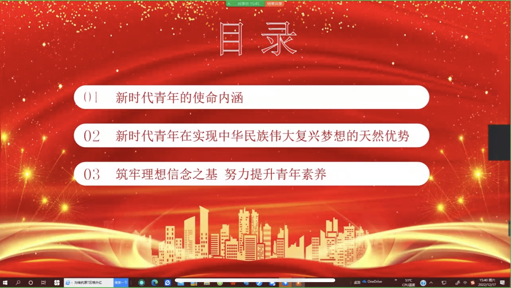 课上,张毅以“党的二十大精神宣讲”为主题,紧扣党的二十大报告原文,围绕党的二十大大会概况及主要成果、大会报告和主要精神、对青年的寄语等内容,对党的二十大精神进行了全面系统的解读。张毅要求全体学员,要深刻领会党的二十大重大意义和重大成果,努力把内容转化为智慧、把智慧应用于实践,用党的二十大精神武装头脑。