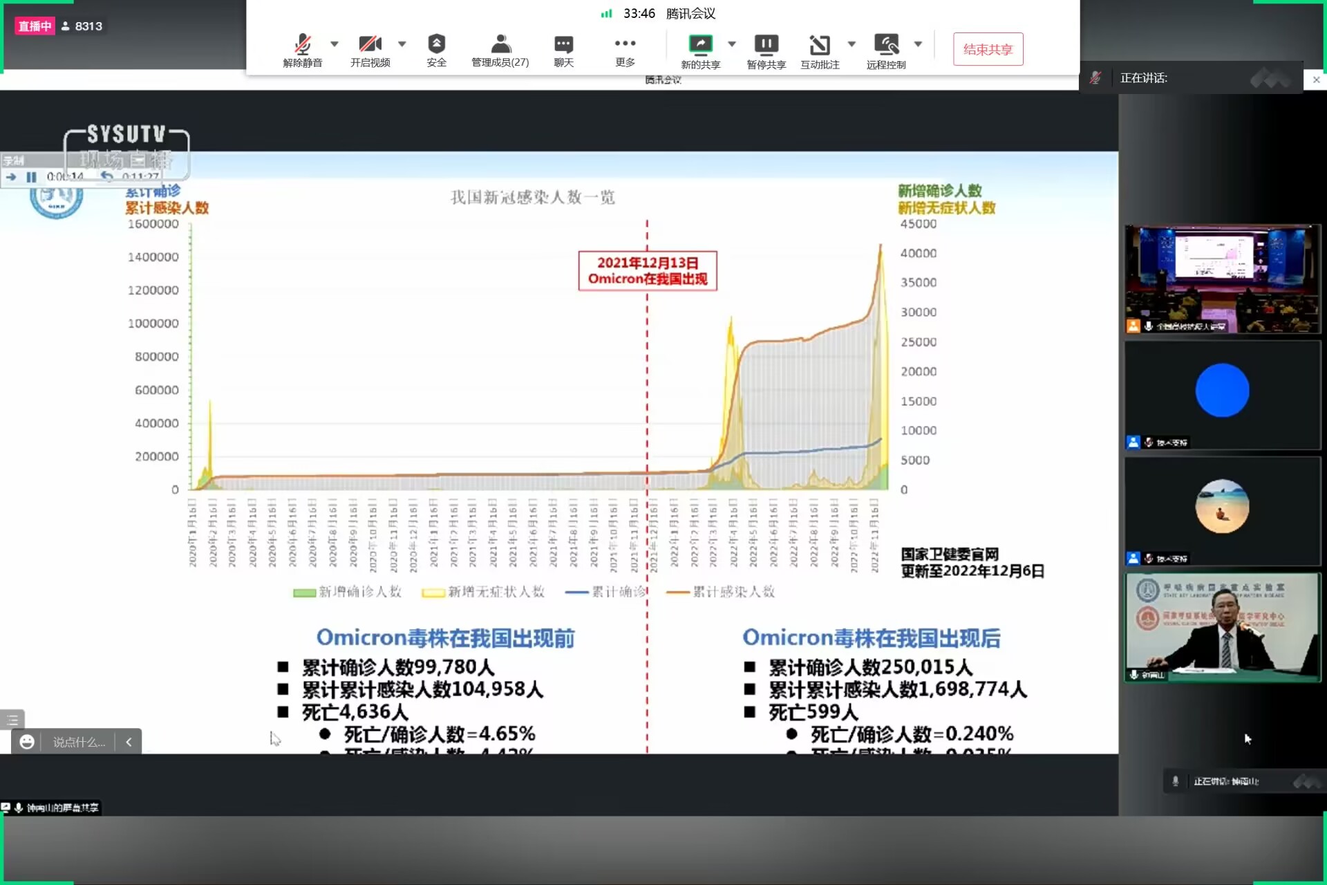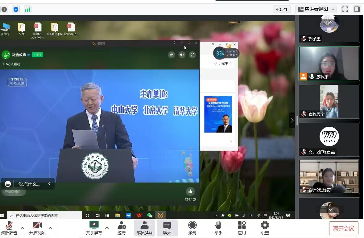 12月15日下午,学校通过线上的方式,组织全体学生、思政课教师以及辅导员、无课教师等共计一万五千人次观看钟南山院士《全国高校疫情大讲座“新冠疫情动态及应对”》,观看师生对中国近三年来抗疫取得的成就感到深深的自豪,同时也对当下时期的的新冠疫情有了更加详细的了解,对攻克疫情尽快恢复正常的生活和学习充满了信心。