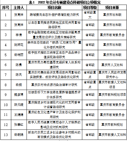 2022年,会计专硕建设点科研工作喜获丰收,成功立项13项省部级项目,其中,1项重大项目、2项重点项目。发表期刊文章21篇(其中,B刊3篇、C刊2篇,SCI 3篇)。科研项目与科研论文进一步聚焦数智财务、绿色审计,为会计专硕建设点奠定坚实的研究基础。 2022年是会计专硕建设点建设元年,财富管理学院与会计学院通过成立科研团队、科研系列活动,全体教职工全心投入,最终在教育教学、学科科研等领域取得了系列显性成果,为会计专硕建设点科研工作奠定了坚实基础。