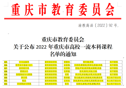 近日,重庆市教委发布了《重庆市教育委员会关于公布2022年重庆市高校一流本科课程名单的通知》(渝教高函〔2022〕92号),我校《行为金融学》、《程序设计基础(C)》等8门课程获得认定。其中,5门线下一流课程,3门线上线下混合式一流课程。