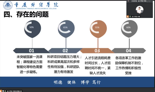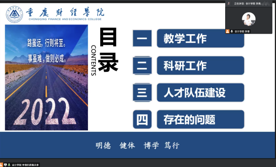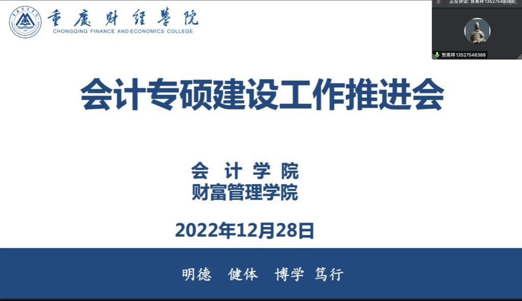 1228午,会计学院财富管理学院线上召开了会计专硕建设工作推进会。校长吴华安教授校长助理张立校长助理崔中山会计学科带头人章新蓉科研处副处长袁毅财富管理学院院长贺高祥会计学院副院长李倩会计学院财富管理学院全体专职教师参会,会议由贺高祥院长主持。