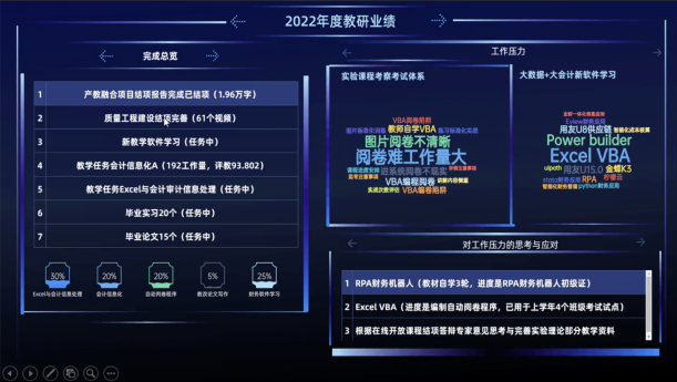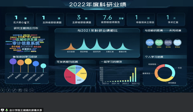 会计学院教师代表王婧婧以大数据的形式向大家分享了其2022年度的科研及教研工作亮点表示在新的征程上我们要不断加强学习和实践始终保持一往无前的奋斗姿态和永不懈怠的精神状态才能不负学校学院学生不负机遇和未来科研处袁毅副处长对于会计专硕建设已取得的成果表示祝贺同时也表示科研处将不遗余力的支持