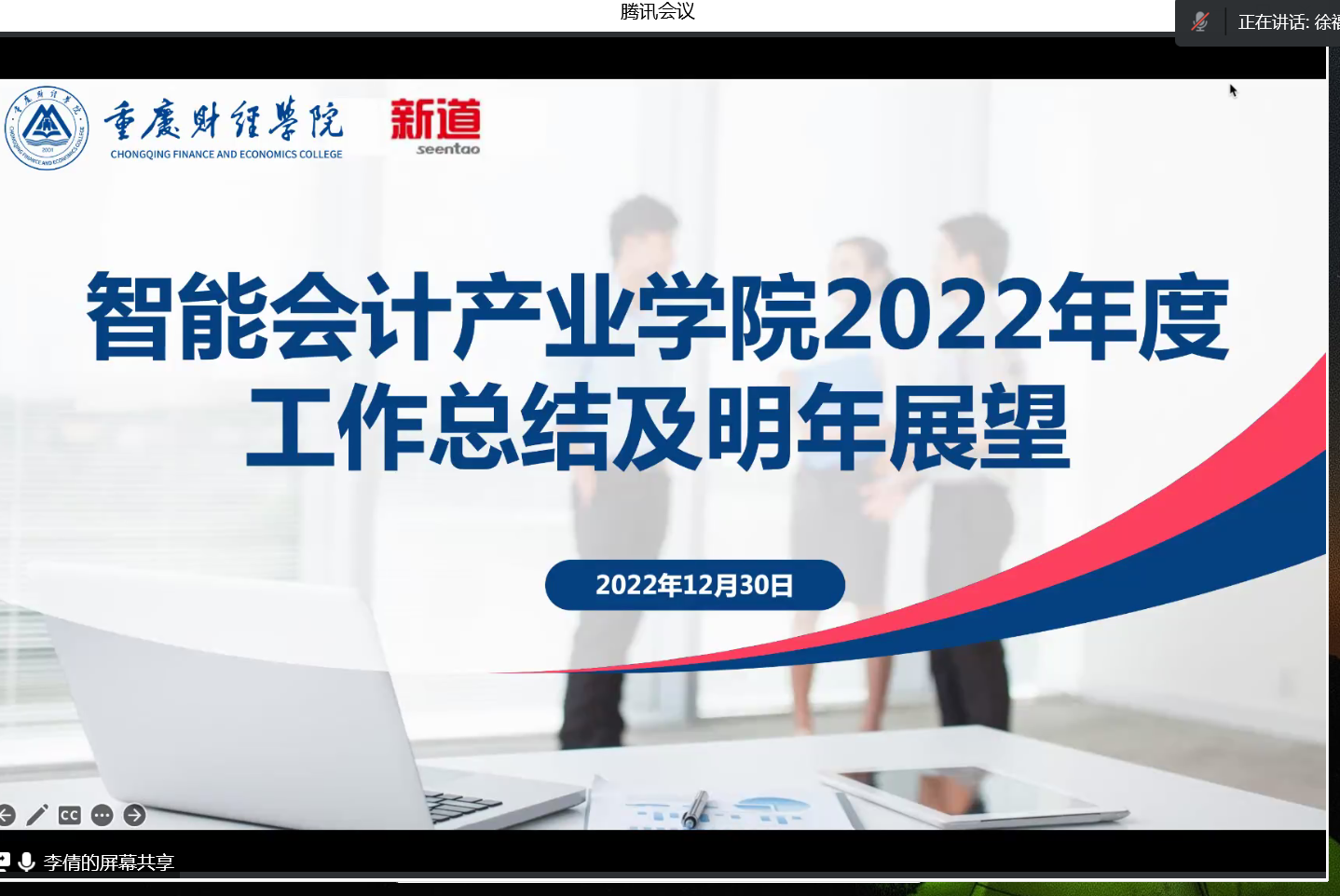 12月30日下午,会计学院联合新道科技股份有限公司召开了新道智能会计学院年度工作总结会。会计学学科带头人章新蓉教授、会计学院副院长李倩副教授、会计学院院长助理杨瑞丽、综合办主任杨欣、教师代表韩佳佚、杨玲玲,新道科技重庆区总经理徐福年、校企合作经理莫正海、教务服务总监徐萍、教学服务总监李志良、驻校导师朱小芳参加了本次会议。