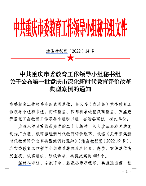 近日,中共重庆市委教育工作领导小组秘书组印发《关于公布第一批重庆市深化新时代教育评价改革典型案例的通知》(渝委教秘发〔2022〕14号),各市委教育工作领导小组成员单位及各区县、高校、有关单位共提交案例485个,经材料审核、专家评审、结果公示等程序,共遴选出第一批重庆市深化新时代教育评价改革典型案例100个,其中特等奖10个,一等奖20个,二等奖30个,三等奖40个。我校案例成果《民办高校“正三角形”评价体系构建探索——以靠谱的电子游戏官网为例》荣获市级“一等奖”,同时获评“优秀组织奖”,为重庆市民办高校唯一。