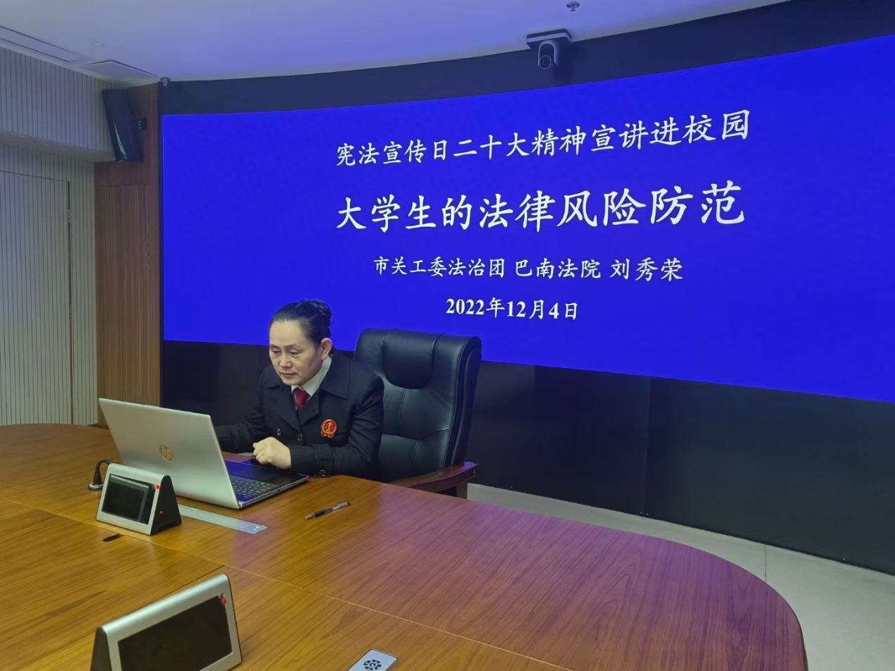 主题宣讲特邀请重庆市巴南区法院副院长刘秀荣开展了题为“大学生的法律风险防范”讲座。刘秀荣围绕现行《中华人民共和国宪法》的概念、宪法的地位和作用、宪法与每个人的密切关系等方面,通过实际案例进行了详细讲解,让同学们对宪法有了更全面、更深刻的认识。