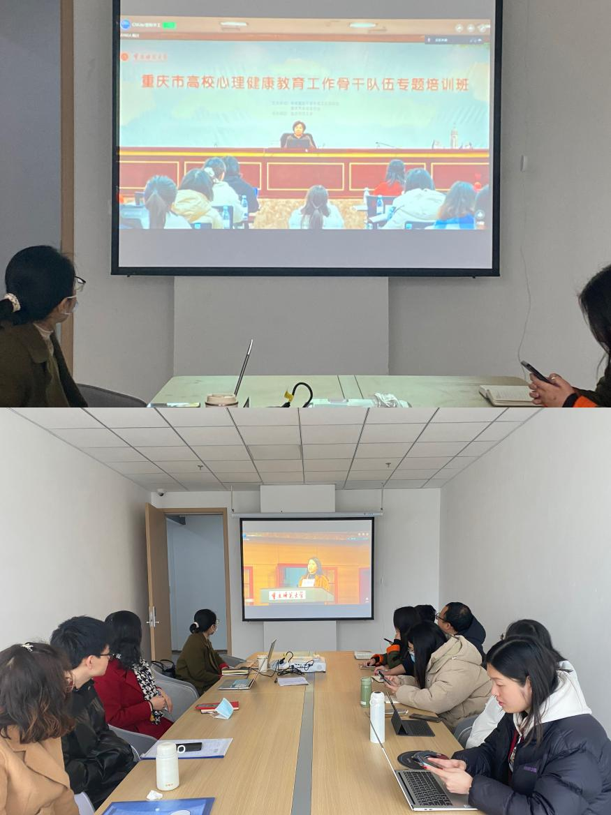 为深入学习宣传贯彻党的二十大精神,不断强化高校心理健康教育工作队伍建设,2023年2月24-25日,我校学工部组织开展“重庆市高校心理健康教育工作骨干队伍专题培训”线上集中学习活动,学校心理健康教育与咨询中心工作人员、辅导员全员参加。为加强学习效果,学工部特组织部分辅导员于24号上午10:00-12:00在G1-105研讨室进行线下集中观看学习。此次培训以“新时代高校心理育人创新与实践”为主题,培训内容包含《大学生自杀危机的干预策略》、《格式塔疗法在学校的应用》、《大学生心理健康“医校联动”操作与实践》三场专家报告。