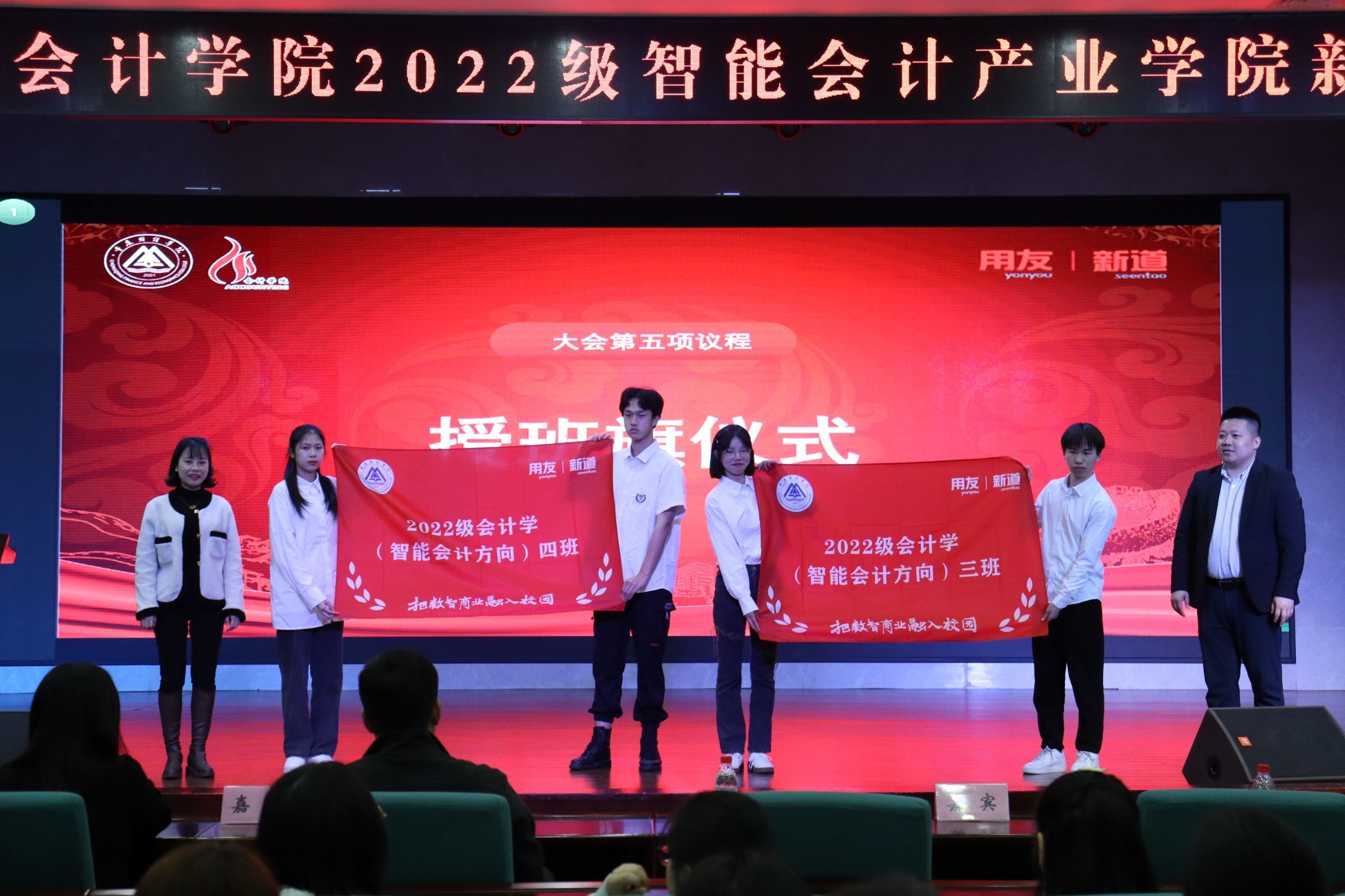 大会上徐福年总经理、李倩副院长为2022级智能会计方向班授旗。班旗的授予鼓舞了每一位2022级智能会计方向班学子的信心,引领着同学们不断前进。