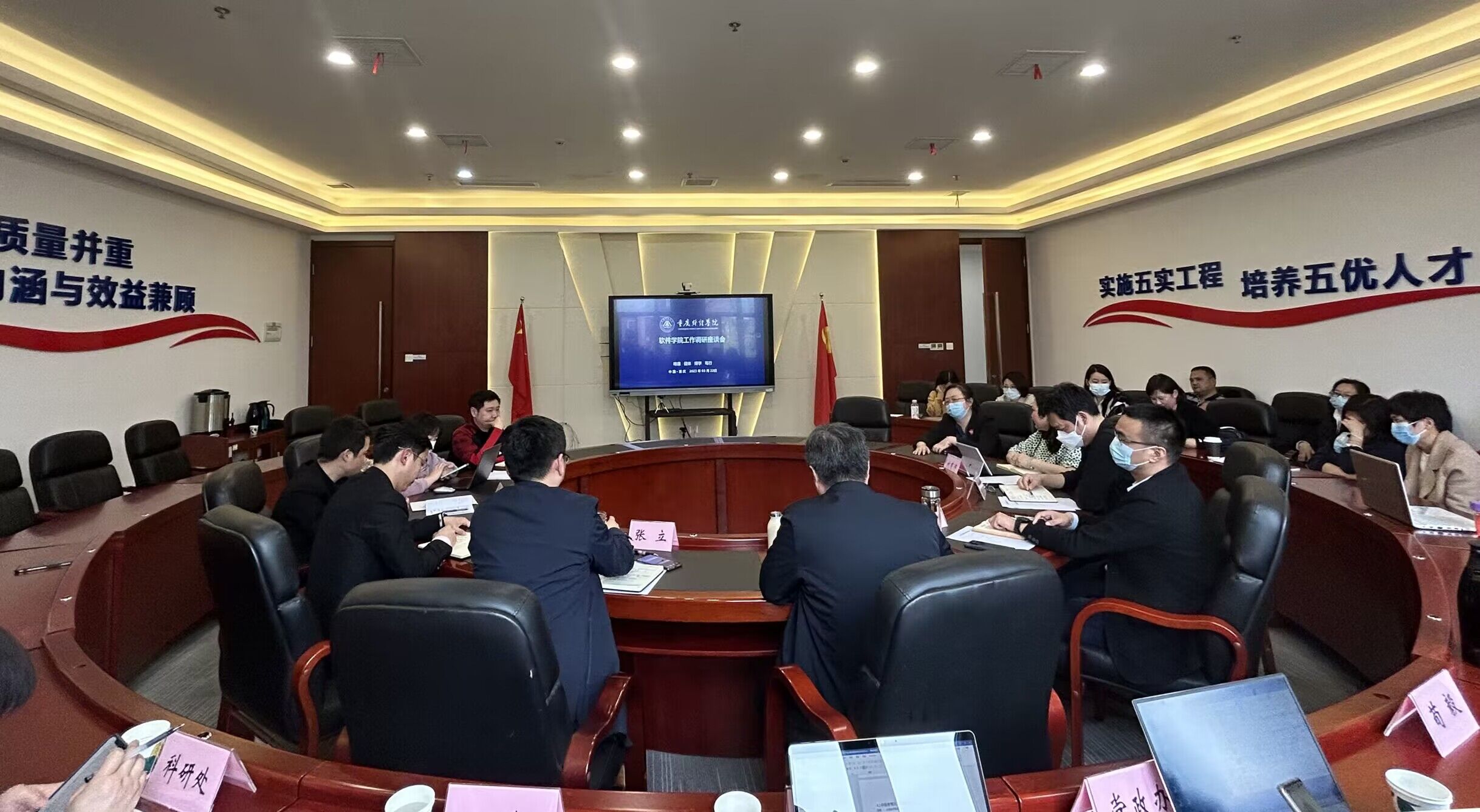 322午,校长吴华安、校长助理崔中山、张立等一行到软件学院调研并指导工作。软件学院院长瞿德刚、党总支副书记刘有沛及全体教职工参加此次座谈会。会议由副院长夏祥礼主持。