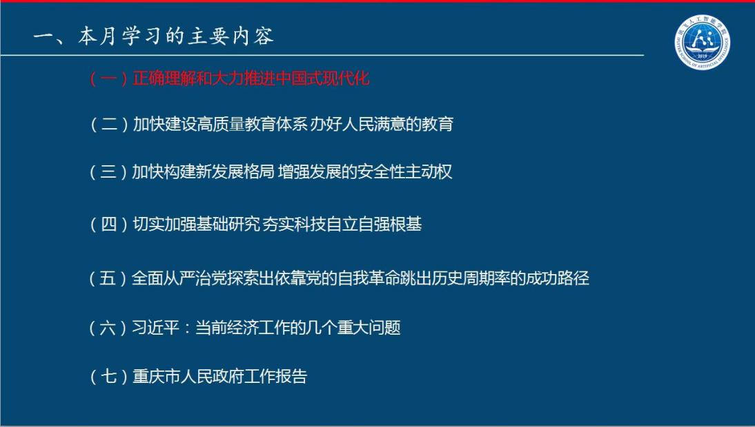 会议伊始,王晓云书记领学3月政治理论学习内容,他结合学习习近平总书记在学习贯彻党的二十大精神研讨班开班式上的重要讲话、习近平总书记在中共中央政治局第三次集体学习时的重要讲话、《全面从严治党探索出依靠党的自我革命跳出历史周期率的成功路径》《加快构建新发展格局增强发展的安全性主动权》《当前经济工作的几个重大问题》《2023年全国教育工作会议》,以及重庆市人民政府工作报告等,宣传贯彻党的二十大精神,特别深入阐释了《正确理解和大力推进中国式现代化》。
